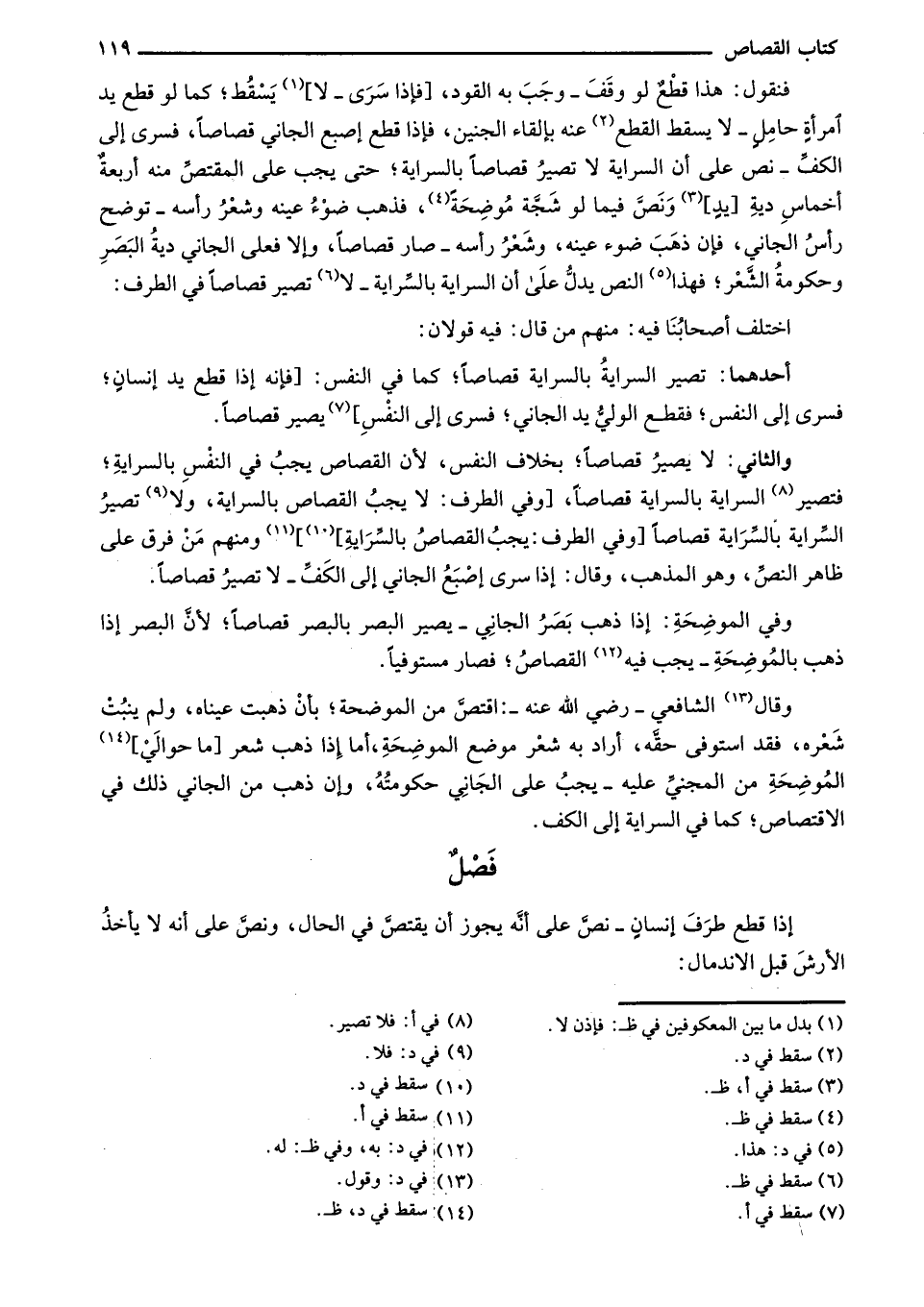 فنقول: هذا قطعٌ لو وقف - وجب به القود، [فإذا سرى - لا] يسقط؛ كما لو قطع يد امرأة حاملٍ - لا سقط القطع عنه بإلقاء الجنين، فإذا قطع إصبع الجاني قصاصاً، فسرى إلى الكفِّ - نص على أن السراية لا تصيرُ قصاصاً بالسراية؛ حتى يجب على المقتص منه أربعةٌ أخماسِ ديةِ [يدٍ] ونص فيما لو شجة موضحةً، فذهب ضوءُ عينه وشعرُ رأسه - توضح رأسُ الجاني، فإن ذهب ضوء عينه، وشعرُ رأسه - صار قصاصاً، وإلا فعلى الجاني ديةُ البصر وحكومةُ الشعر؛ فهذا النص يدل على أن السراية بالسراية - لا تصير قصاصاً في الطرف: