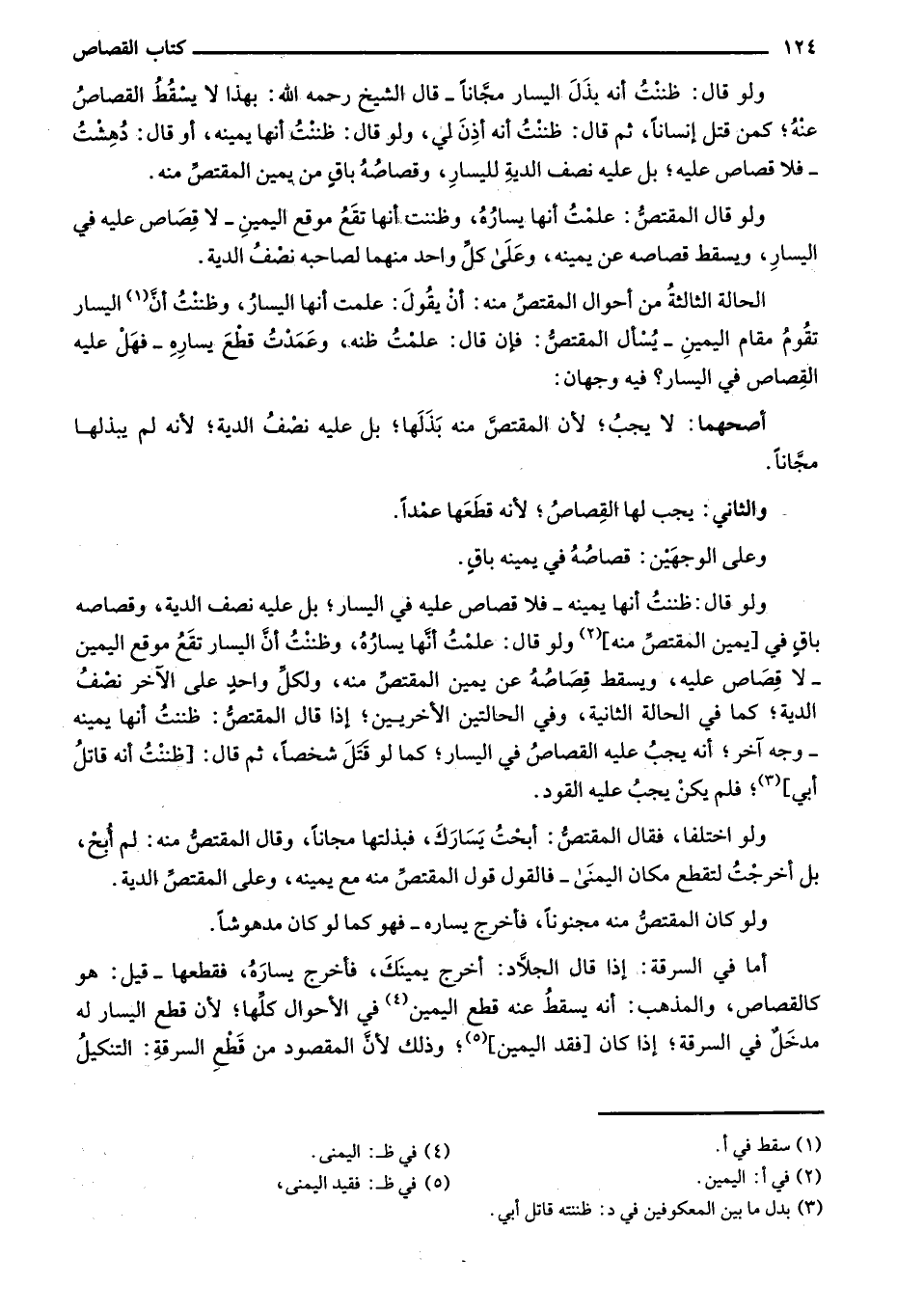 ولو قال: ظننت أنها يمينه - فلا قصاص عليه في اليسار؛ بل عليه نصف الدية، وقصاصه باقٍ في [يمين المقتص منه] ولو قال: علمت أنها يساره، وظننت أن اليسار تقع موقع اليمين - لا قصاص عليه، ويسقط قصاصه عن يمين المقتص منه، ولكل واحدٍ على الآخر نصف الدية؛ كما في الحالة الثانية، وفي الحالتين الأخريين؛ إذا قال المقتص: ظننت أنه يمينه - وجه آخر؛ أنه يجب عليه القصاص في اليسار؛ كما لو قتل شخصاً، ثم قال: [ظننت أنه قاتل أبي]؛ فلم يكن يجب عليه القود.