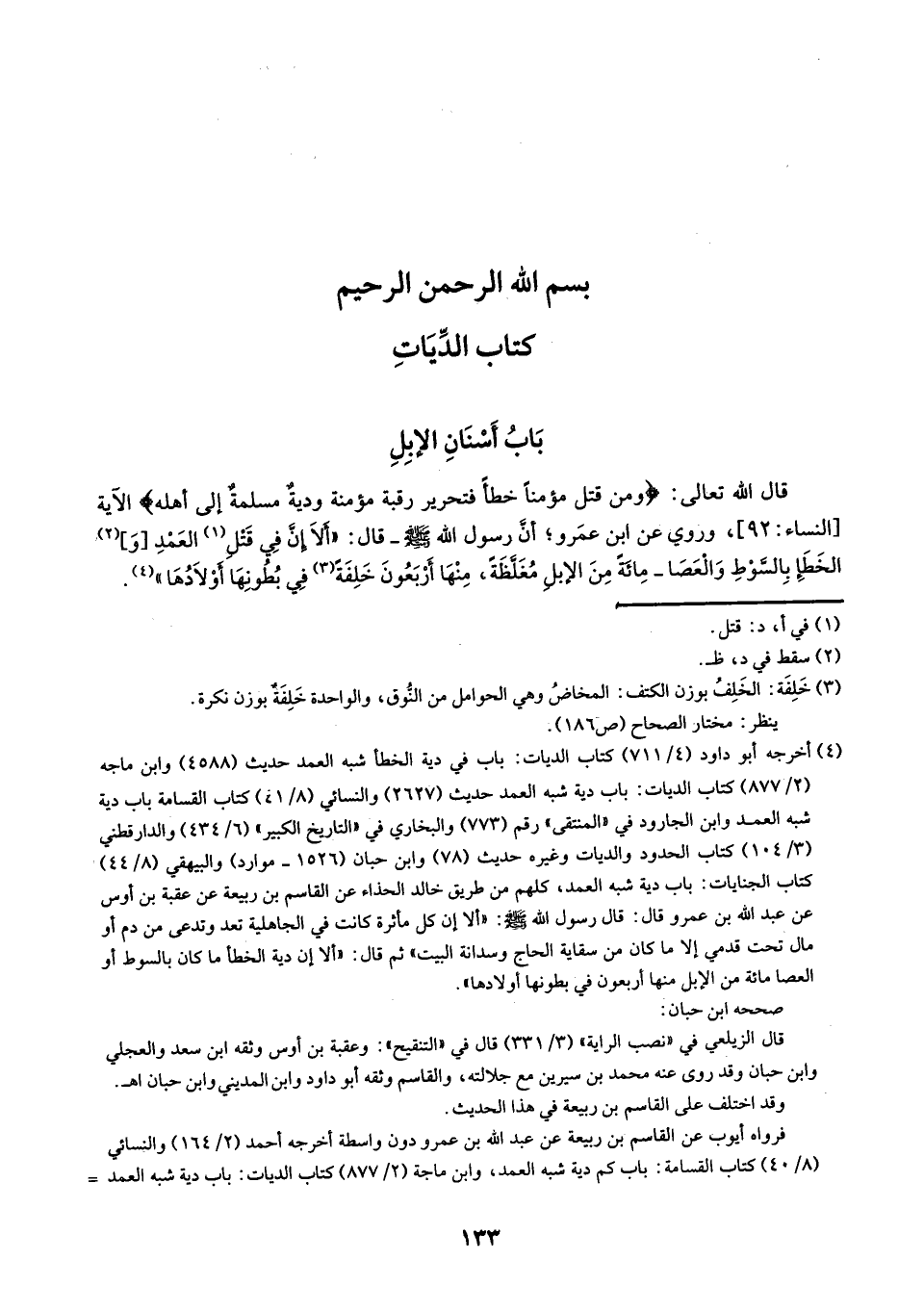 قال الله تعالى: {وَمَنْ قَتَلَ مُؤْمِناً خَطَأً فَتَحْرِيرُ رَقَبَةٍ مُؤْمِنَةٍ وَدِيَةٌ مُسَلَّمَةٌ إِلَى أَهْلِهِ} الآية [النساء: 92]، وروي عن ابن عمرو؛ أن رسول الله - صلى الله عليه وسلم - قال:"ألا عن في قتل العمد [و] الخطإ بالسوط والعصا - مائة من الإبل مغلظة، منها أربعون خلفةً في بطونها أولادها".