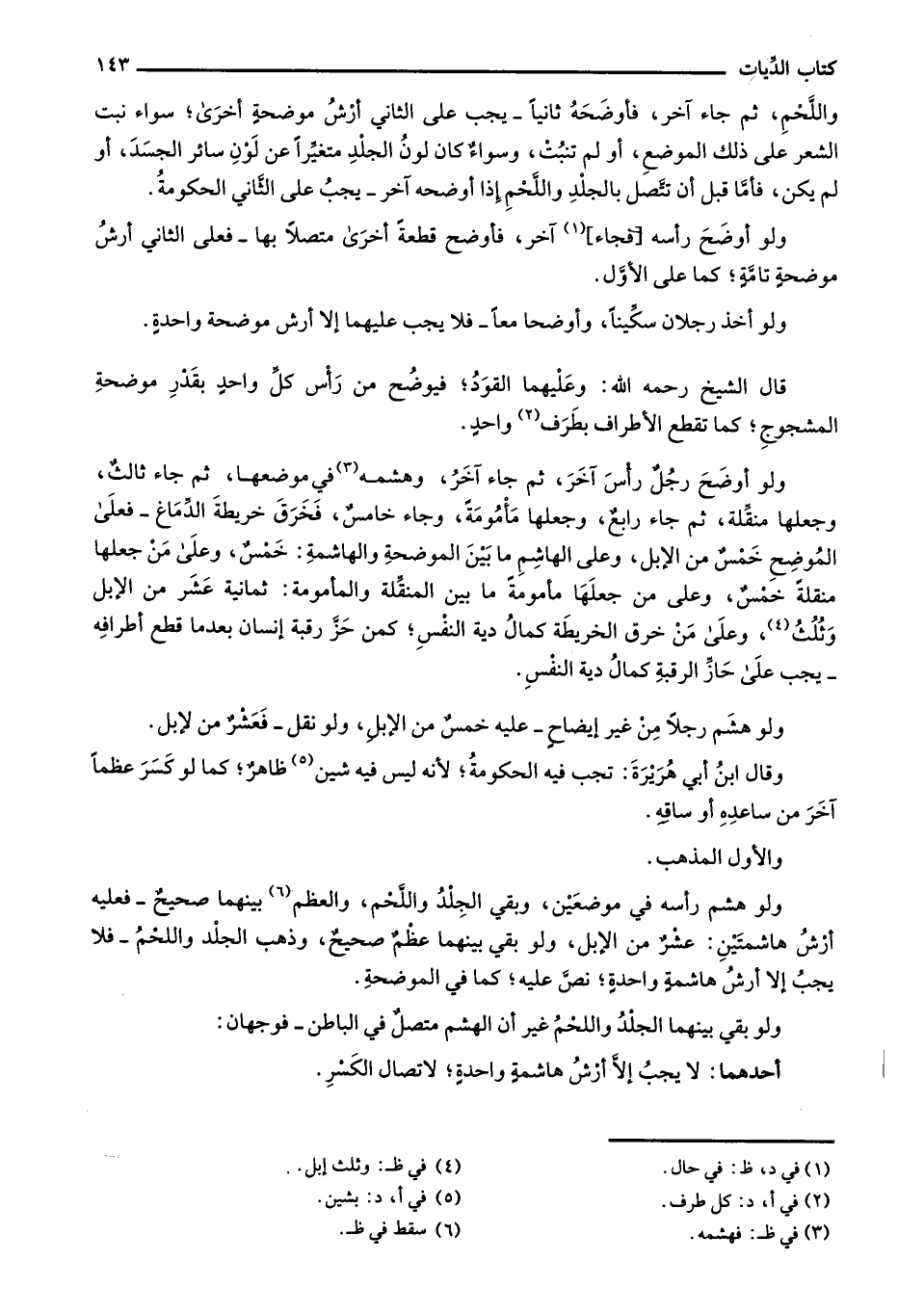 ولو أوضح رجلٌ رأس آخر، ثم جاء آخر، وهشمه في موضعها، ثم جاء ثالثٌ، وجعلها منقلة، ثم جاء رابعٌ، وجعلها مأمومة، وجاء خامسٌ، فخرق خريطة الدماغ -فعلى الموضح خمسٌ من الإبل، وعلى الهاشم ما بين الموضحة والهاشمة: خمسٌ، وعلى من جعلها منقلة خمسٌ، وعلى من جعلها مامومةً ما بن المنقلة والمأمومة: ثمانية عشر من الإبل وثلث، وعلى من خرق الخريطة كمالُ دية النفس؛ كمن حز رقبة إنسان بعدما قطع أطرافه -يجب على حازِّ الرقبة كمالُ دية النفس.