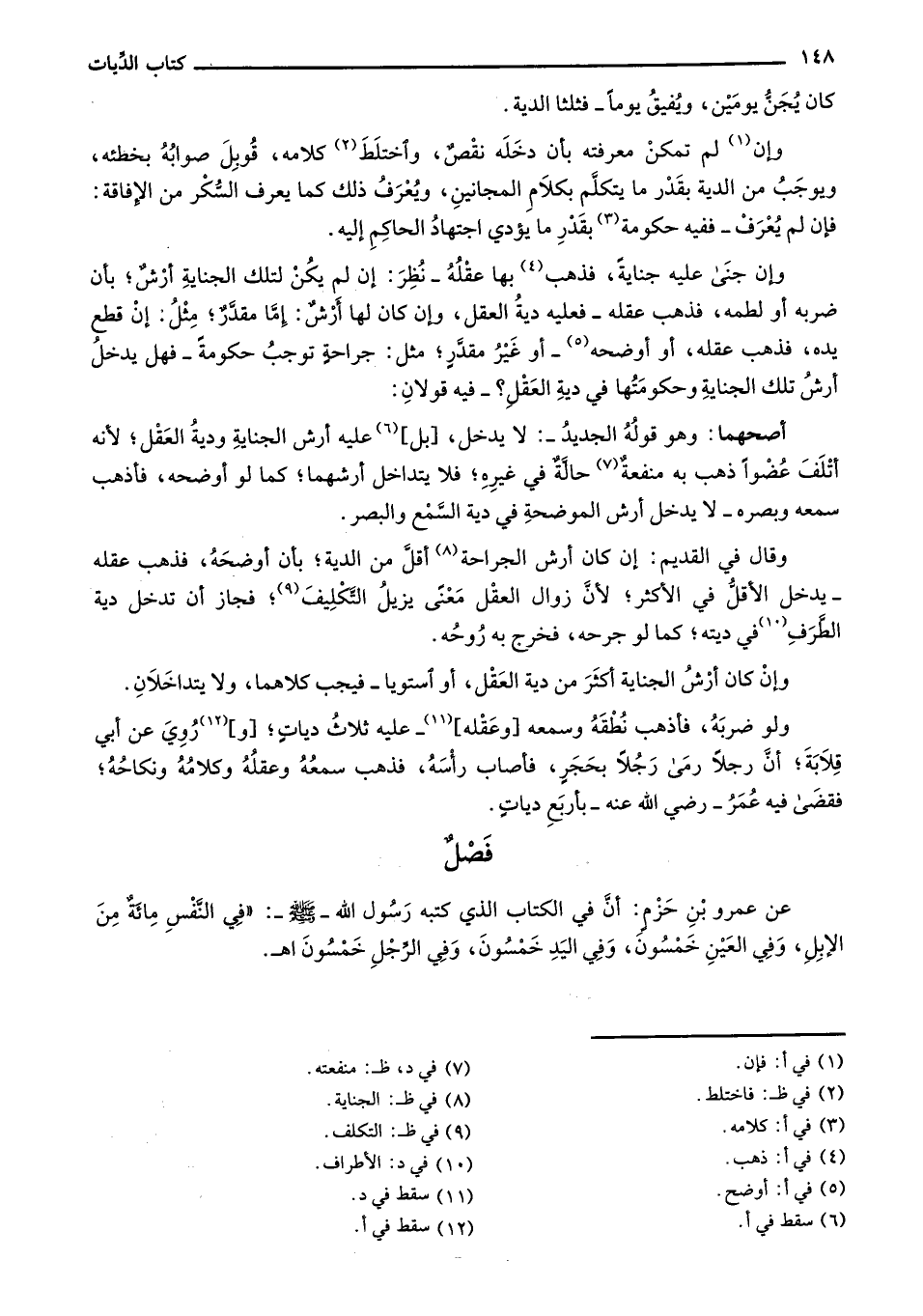 عن عمرو بن حزمٍ: أن في الكتاب الذي كتبه رسول الله - صلى الله عليه وسلم -:"في النفس مائة من الإبل، وفي العين خمسون، وفي اليد خمسون، وفي الرجل خمسون أهـ