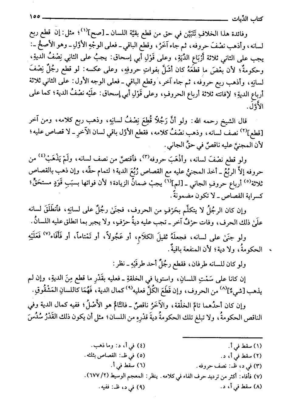 قال الشيخ رحمه الله: ولو أن رجلاً قُطع نصف لسانه، وذهب ربع كلامه، ومن آخر [قطع] نصف لسانه، وذهب نصف كلامه، فقطع الأول باقي لسان الآخر - لا قصاص عليه؛ لأن المجني عليه ناقصٌ في حق الجاني.
