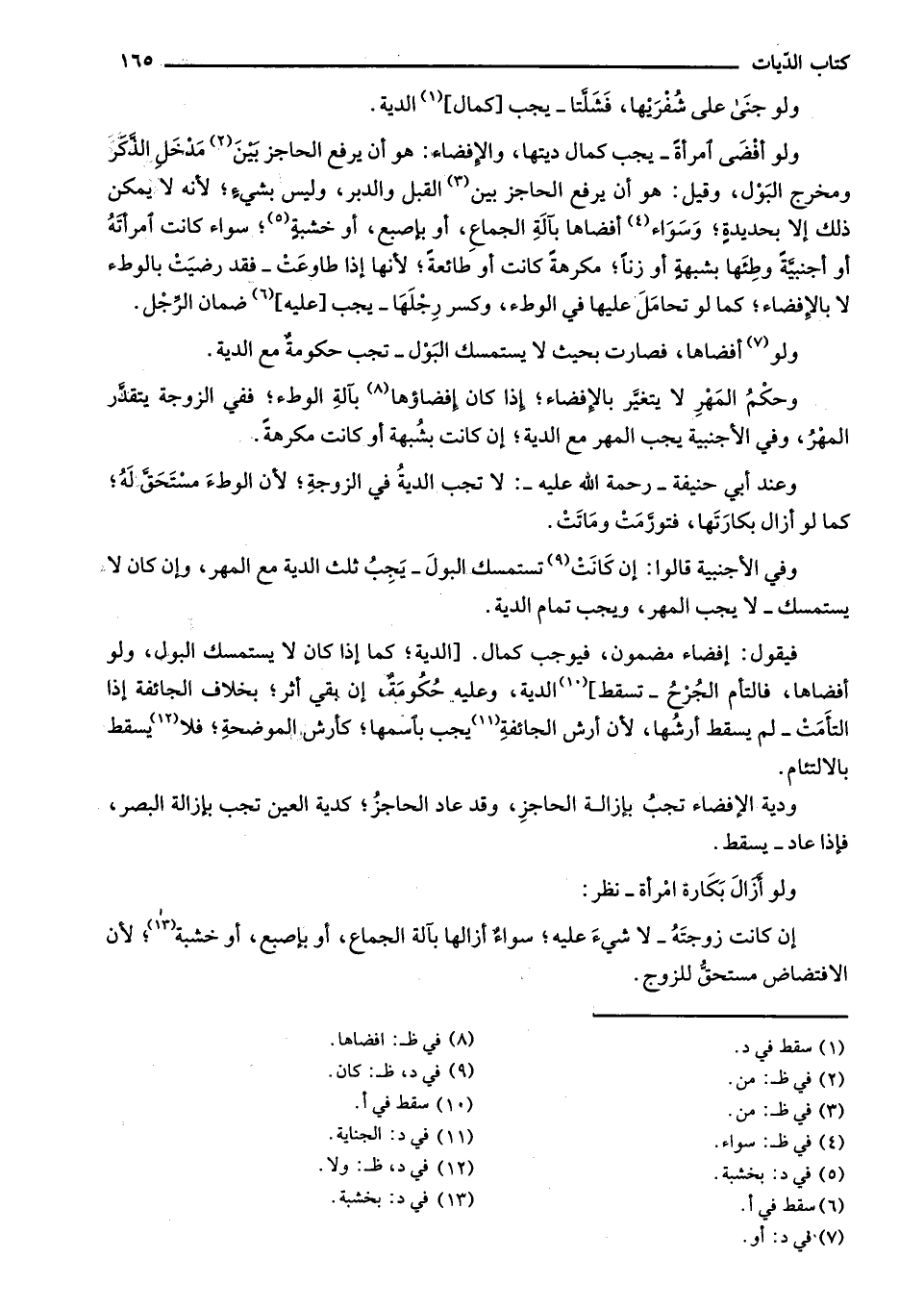 ولو أفضى امرأة - يجب مال ديتها، والإفضاء: هو أن يرفع الحاجز بين مدخل الذكر ومخرج البول، وقيل: هو أن يرفع الحاجز بين القبل والدبر، وليس بشيء؛ لأنه لا يمكن ذلك إلا بحديدةٍ؛ وسواء أفضاها بآلة الجماع، أو بإصبع، وخشبةٍ؛ سواء كانت امرأته أو أجنبية وطئها بشبهةٍ أو زناً؛ مكرهةً كانت أو طائعةً؛ لأنها إذا طاوعت - فقد رضيت بالوطء لا بالإفضاء؛ كما لو تحامل عليها في الوطء، وكسر رجلها - يجب [عليه] ضمان الرجل.