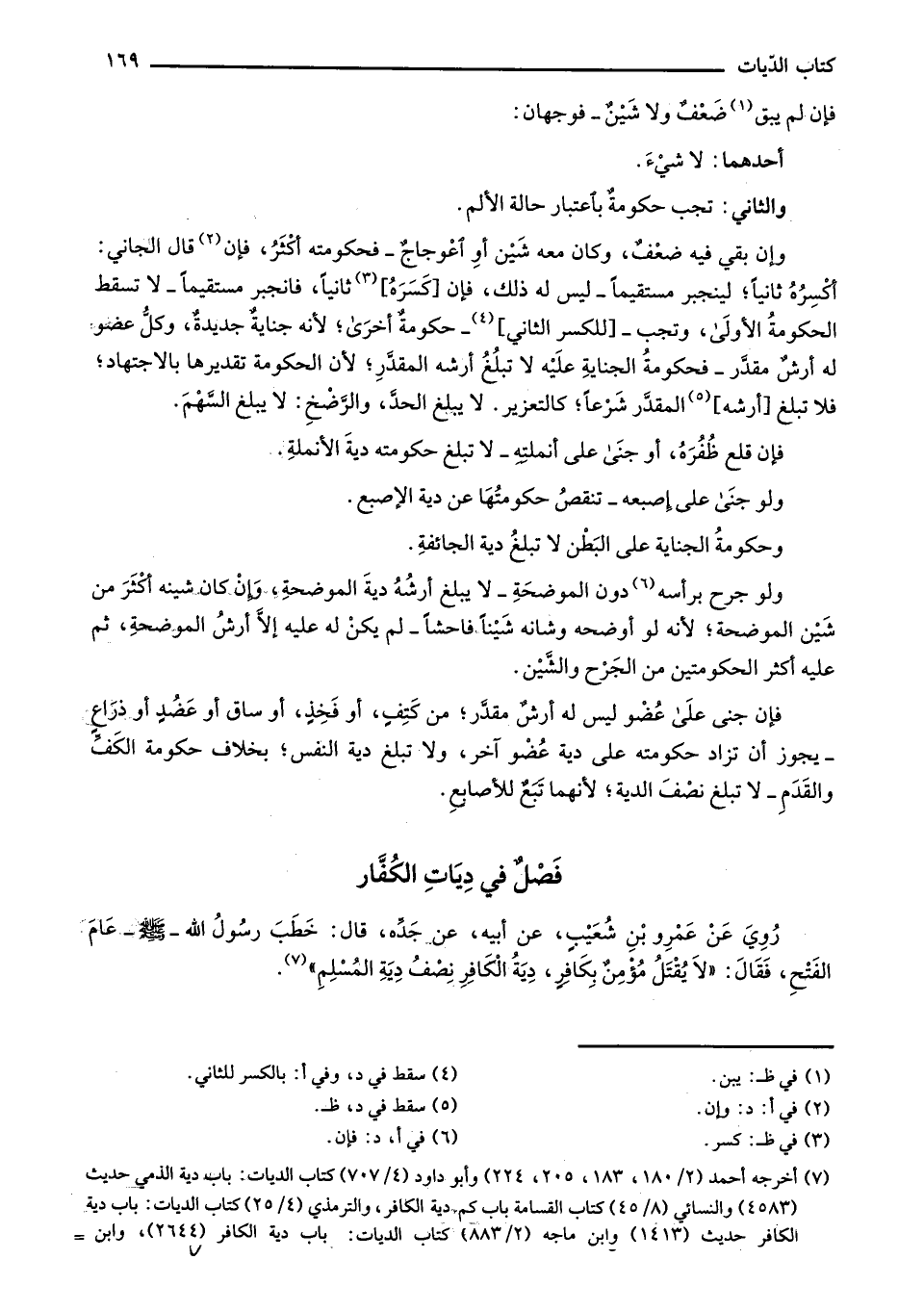 رُوي عن عمرو بن شعيب، عن أبيه، عن جده، قال: خطب رسول الله - صلى الله عليه وسلم- عام الفتح، فقال: "لا يقتل مؤمن بكافرٍن دية الكافر نصف دية المسلم".