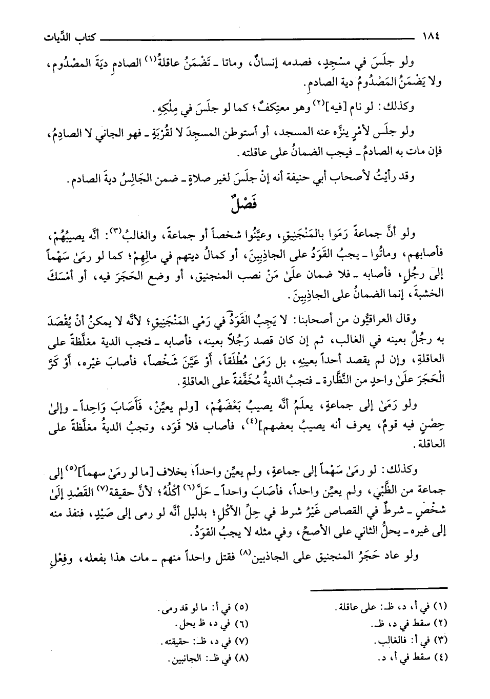ولو أن جماعة رموا بالمنجنيق، وعينوا شخصاً أو جماعة، والغالب: أنه يصيبهم فأصابهم، وماتوا - يجب القود على الجاذبين، أو كمال ديتهم في مالهم؛ كما لو رمى سهماً إلى رجل، فأصابه - فلا ضمان على من نصب المنجنيق، أو وضع الحجر فيه، أو أمسك الخشبة، إنما الضمان على الجاذبين.