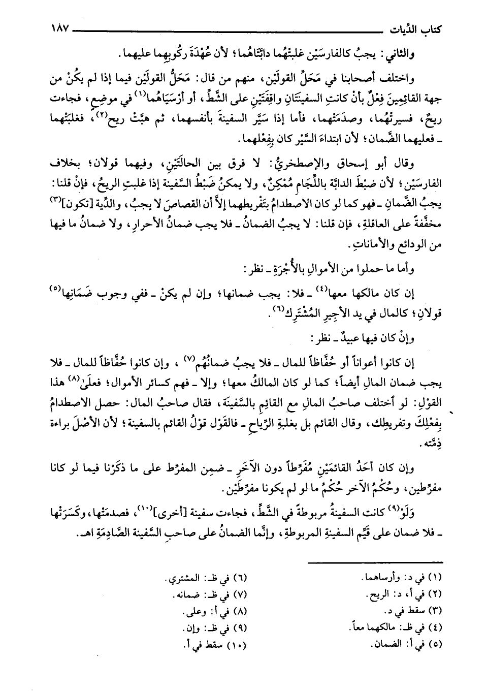 ولو كانت السفينة مربوطة في الشط، فجاءت سفينة [أخرى]، فصدمتها، وكسرتها - فلا ضمان على قيم السفينة المربوطة، وإنما الضمان على صاحب السفينة الصادمة أهـ.