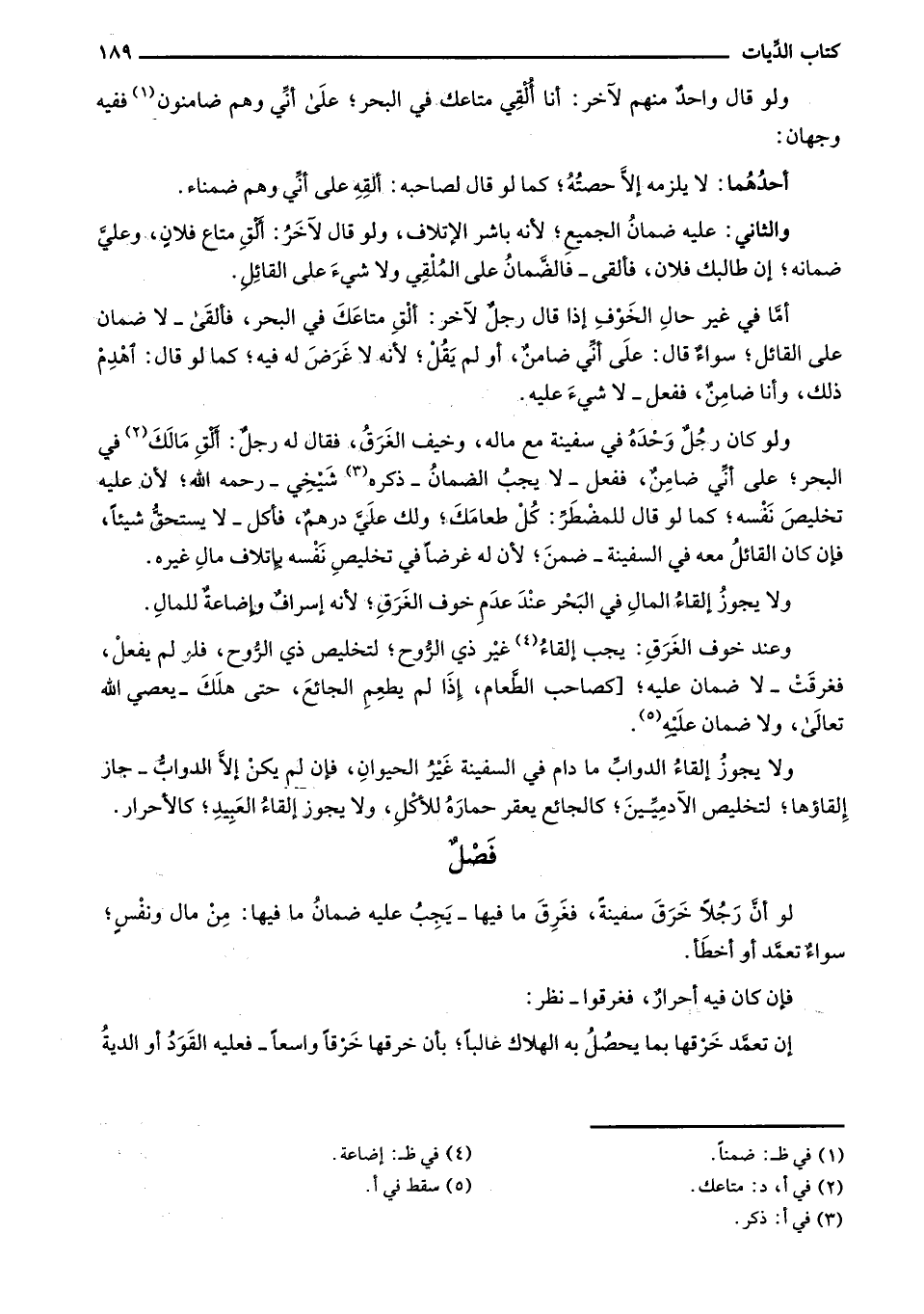 ولا يجوز إلقاء الدواب ما دام في السفينة غير الحيوان، فإن لم يكن إلا الدواب - جاز إلقاؤها؛ لتخليص الآدميين؛ كالجائع يعقر حماره للأكل، ولا يجوز إلقاء العبيد؛ كالأحرار.