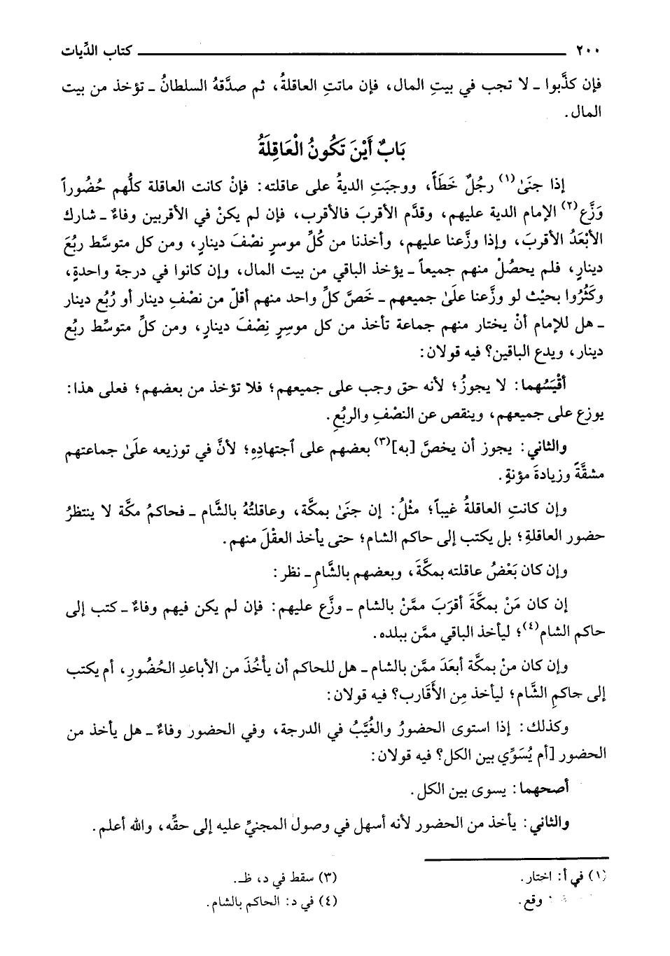 وإن كانت العاقلة غيباً؛ مثل: إن جنى بمكة، وعاقلته بالشام - فحاكم مكة لا ينتصر حضور العاقلة؛ بل يتب إلى حاكم الشام؛ حتى يأخذ العقل منهم.