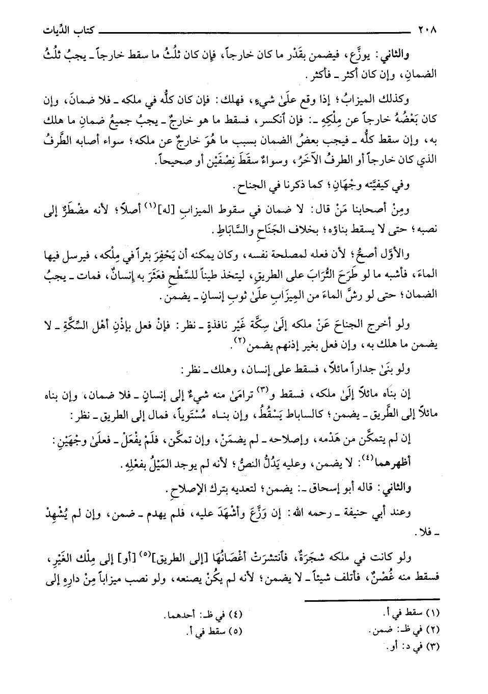 ومن أصحابنا من قال: لا ضمان في سقوط الميزاب [له] أصلاً؛ لأنه مضطر إلى نصبه؛ حتى لا يسقط بناؤه؛ بخلاف الجناح والساباط.