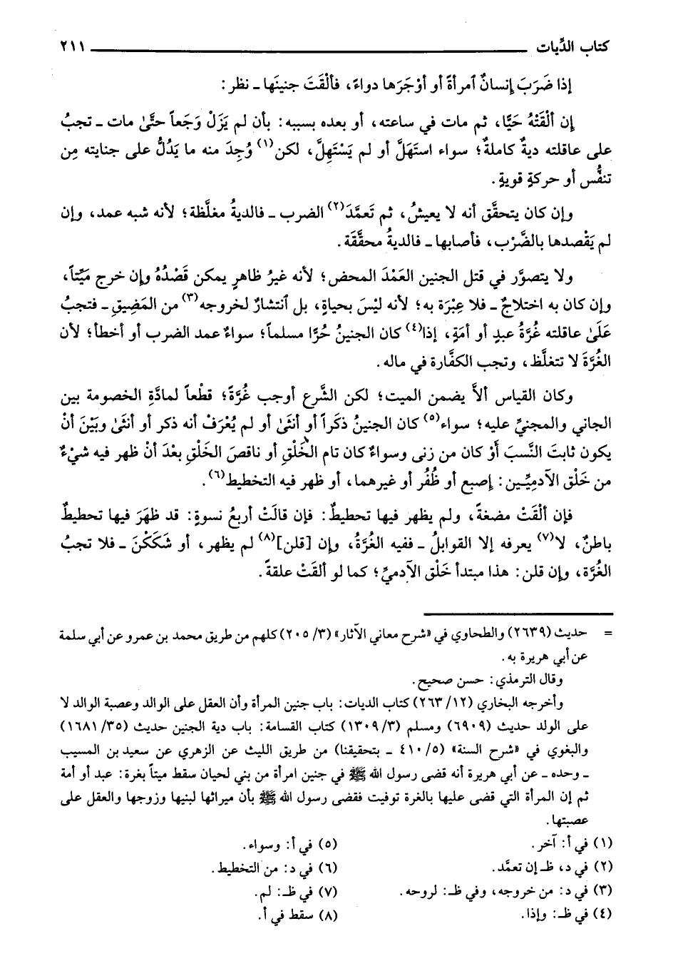 وكان القياس ألا يضمن الميت؛ لكن الشرع أوجب غرة؛ قطعاً لماة الخصومة بين الجاني والمجني عليه؛ سواء كان الجنين ذكراً أو أنثى أو لم يعرف أنه ذكر أو أنثى وبين أن يكون ثابت النسب أو كان من زنى وسواءٌ كان تام الخلق أو ناقص الخلق بعد أن ظهر فيه شيء من خلق الآدميين: إصبع أو ظفر أو غيرهما، أو ظهر فيه التخطيط.
