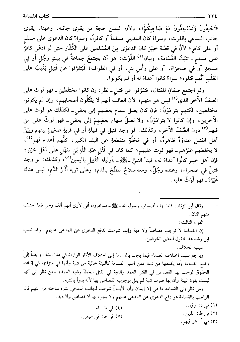"تحلقون وتستحقون دم صاحبكم"، ولأن اليمين حجة من يقوى جانبه، وههنا: يقوى جانب المدعي باللوث، وسواءٌ كان المدعي مسلماً أو كافراً، وسواءٌ كان الدعوى على مسلم أو على كافرٍ؛ لأن في قصة خيبر كان الدعوى من المسلمين على الكفار حتى لو ادعى كافرٌ على مسلم - تثبت القسامة، وبيان اللوث: هو أن يجتمع جماعةٌ في بيت رجلٍ أو في مسجد أو في صحراء، أو على رأس بئرس، أو في الطواف؛ فيتفرقوا عن قتيل يغلب على القلب أنهم قتلوه؛ سواءٌ كانوا أعداء له أو لم يكونوا.