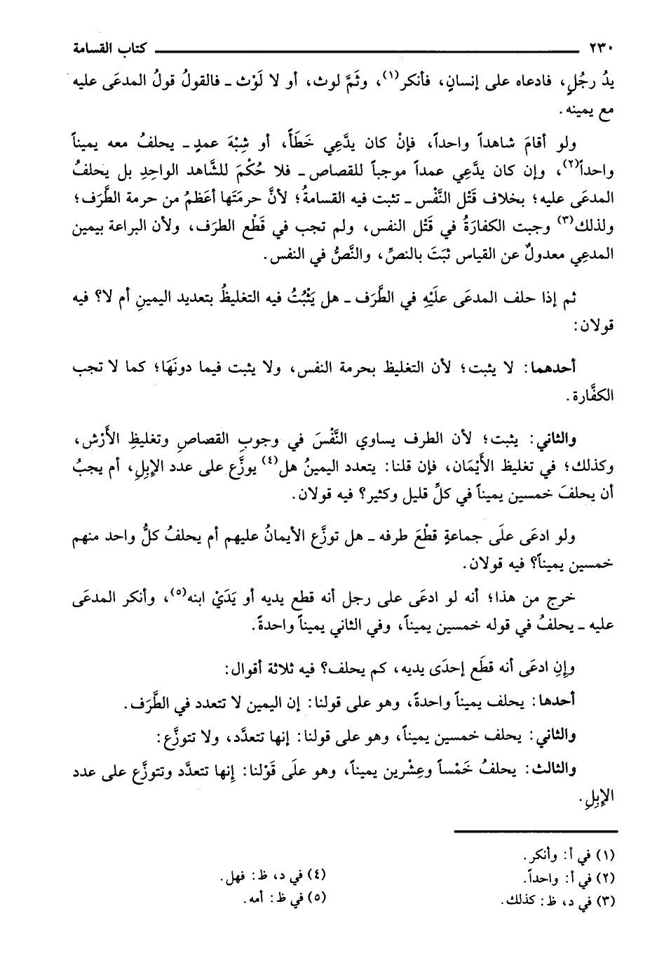 والثاني: يثبت؛ لأن الطرف يساوي النفس في وجوب القصاص وتغليظ الأرش، وكذلك؛ في تغليظ الأيمان، فإن قلنا: يتعدد اليمين هل يوزع على عدد الإبل، أم يجب أن يحلف خمسين يميناً في كل قليل وكثير؟ فيه قولان.