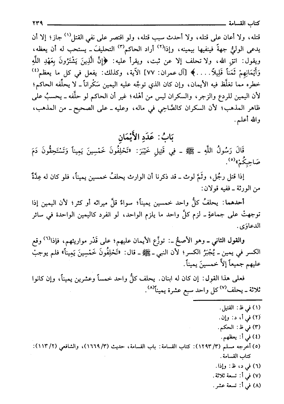 والقول الثاني- وهو الأصح-: توزع الأيمان عليهم؛ على قدر مواريثهم، فإذا وقع الكسر في يمين - يجبر السر؛ لأن النبي - صلى الله عليه وسلم - قال:"تحلفون خمسين يميناً" فلم يوجب عليهم جميعاً إلا خمسين يميناً.