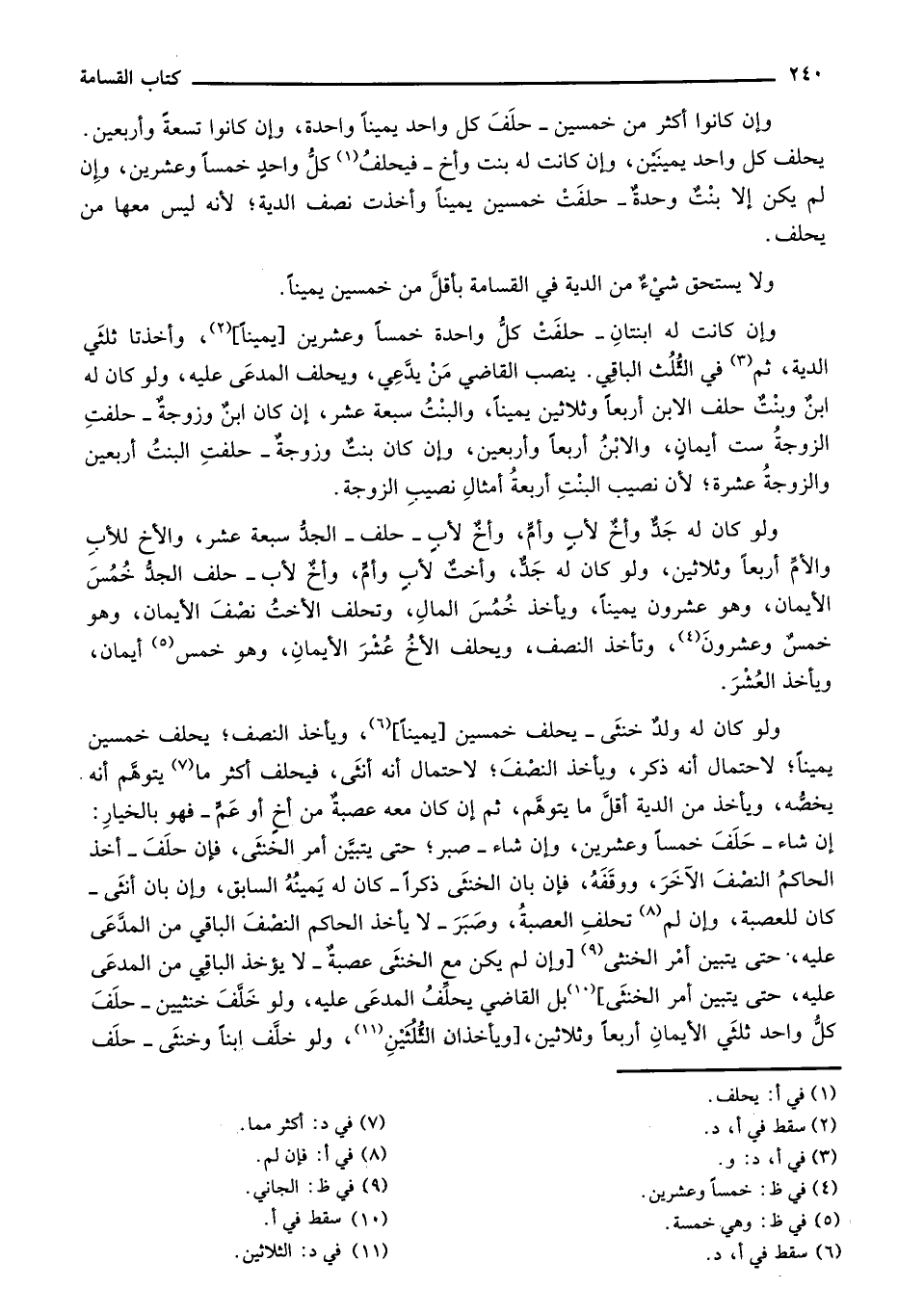 وإن كانت له ابنتان - حلفت كل واحدة خمساً وعشرين [يميناً]، وأخذتا ثلثي الدية، ثم في الثلث الباقي. ينصب القاضي من يدعين ويحلف المدعي عليه، ولو كان له ابن وبنتٌ حلف الابن أربعاً وثلاثين يميناً، والبنت سبعة عشر، إن كان ابن وزوجة - حلفت الزوجة ست أيمان، والابن أربعاً وأربعين، وإن كان بنت وزوجة - حلفت البنت أربعين والزوجة عشرة؛ لأن نصيب البنت أربعة أمثال نصيب الزوجة.