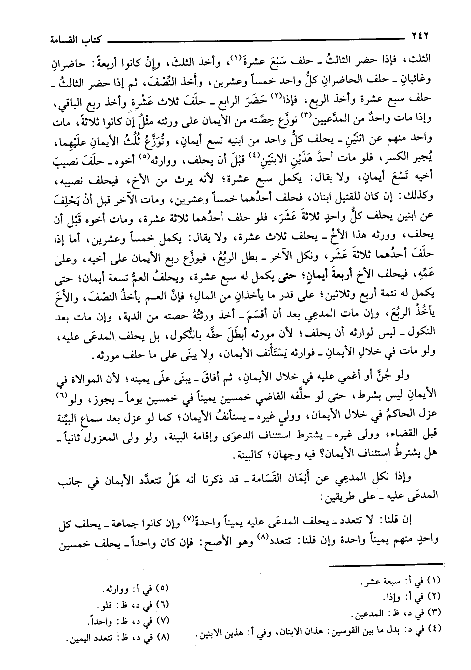 الثلث، فإذا حضر الثالثُ - حلف سبع عشرة، وأخذ الثلث، وإن كانوا أربعةً: حاضران وغائبان - حلف الحاضران كل واحد خمساً وعشرين، وأخذ النصف، ثم إذا حضر الثالث - حلف سبع عشرة وأخذ الربع، فإذا حضر الرابع -حلف ثلاث عشرة وأخذ ربع الباقي، وإذا مات واحدٌ من المدعيين توزع حصته من الأيمان على ورثته مثل إن كانوا ثلاثة، مات واحد منهم عن اثنين - يحلف كل واحد من ابنيه تسع أيمان، وتوزع ثلث الأيمان عليهما، يُجبر الكسر، فلو مات أحد هذين الابنين قبل أن يحلف، ووارثه أخوه -حلف نصيب أخيه تسع أيمان، ولا يقال: يكمل سبع عشرة؛ لأنه يرث من الأخ، فيحلف نصيبه، وكذلك: إن كنا للقتيل ابنان، فحلف احدهما خمساً وعشرين، ومات الآخر قبل أن يحلف عن ابنين يحلف كل واحد ثلاثة عشر، فلو حلف أحدهما ثلاثة عشرة، ومات اخوه قبل أن يحلفن وورثه هذا الأخ - يحلف ثلاث عشرة، ولا يقال يملك خمساً وعشرين، أما إذا حلف أحدهما ثلاثة عشر، ونكل الآخر - بطل الربع، فيوزع ربع الأيمان على أخيه، وعلى عمه، فيحلف الأخ أربعة أيمان؛ حتى يكمل له سبع عشرة، ويحلف العم تسعة أيمان؛ حتى يكمل له تتمة أربع وثلاثين؛ على قدر ما يأخذان من المال؛ فإن العم يأخذ النصف، والأخ يأخذ الربع، وإن مات المدعي بعد أن أقسم - أخذ ورثته حصته من الدية، وإن مات بعد النكول - ليس لوارثه أن يحلف؛ لأن مورثه أبطل حقه بالنكول، بل يحلف المدعى عليه، ولو مات في خلال اليمان - فوارثه يستأنف الأيمان، ولا يبنى على ما حلف مورثه.