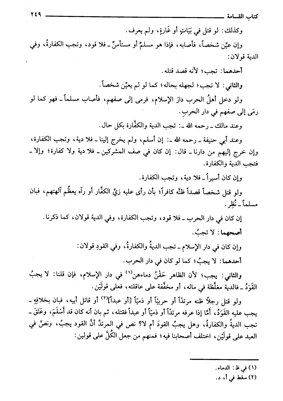 إن كان في دار الحرب - فلا قود، وتجب الكفارة، وفي الدية قولان، كما ذكرنا.
