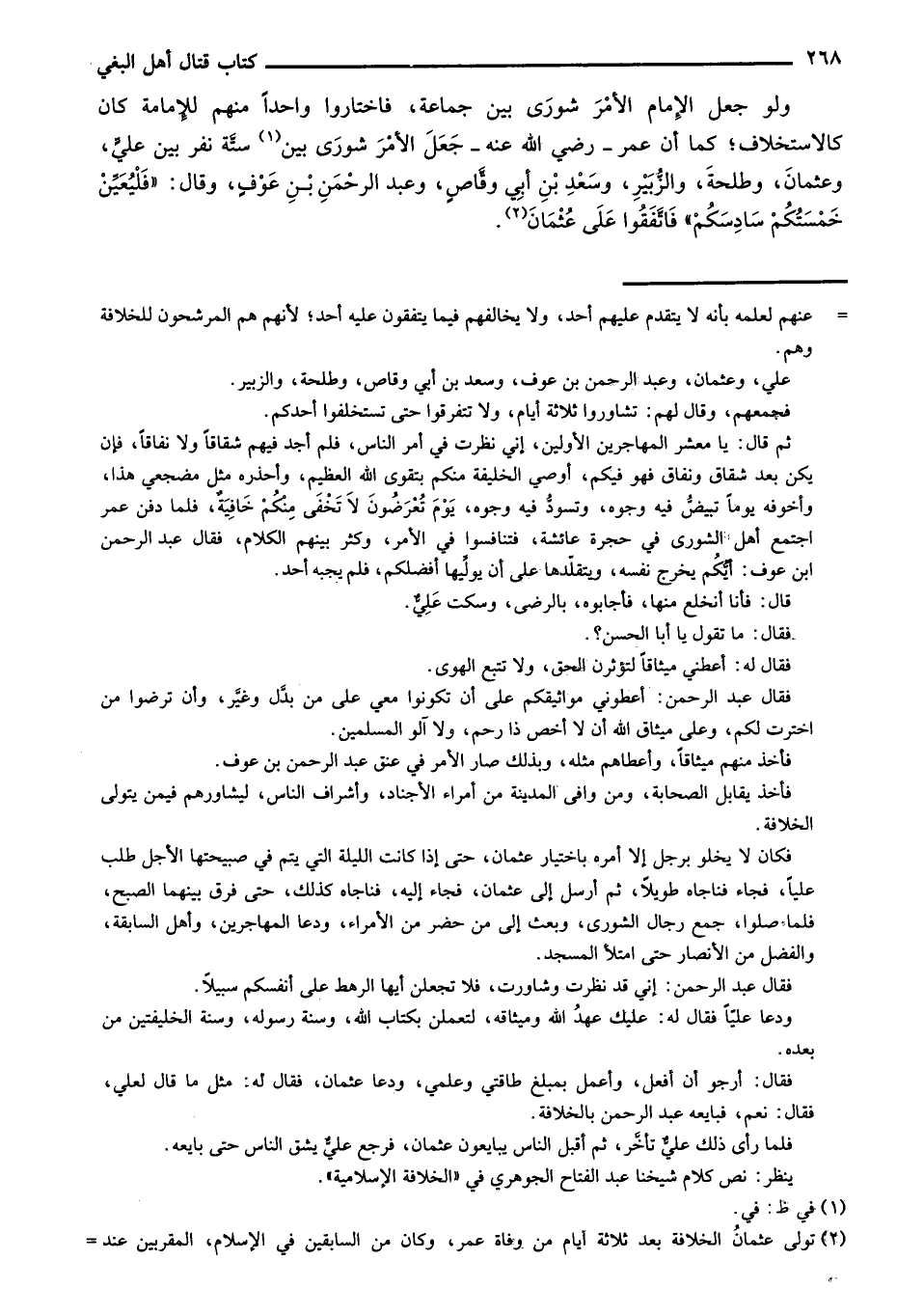 ولو جعل الإمام الأمر شورى بين جماعة، فاختاروا واحداً منهم للإمامة كان كالاستخلاف؛ كما أنعمر -رضي الله عنه - جعل الأمر شورى بين ستة نفر بين عليٍّ، وعثمان، وطلحة، والزبير، وسعد بن أبي وقاصٍ، وعبد الرحمن بن عوفٍ، وقال: "فليعين خمستكم سادسكم" فاتفقوا على عثمان.