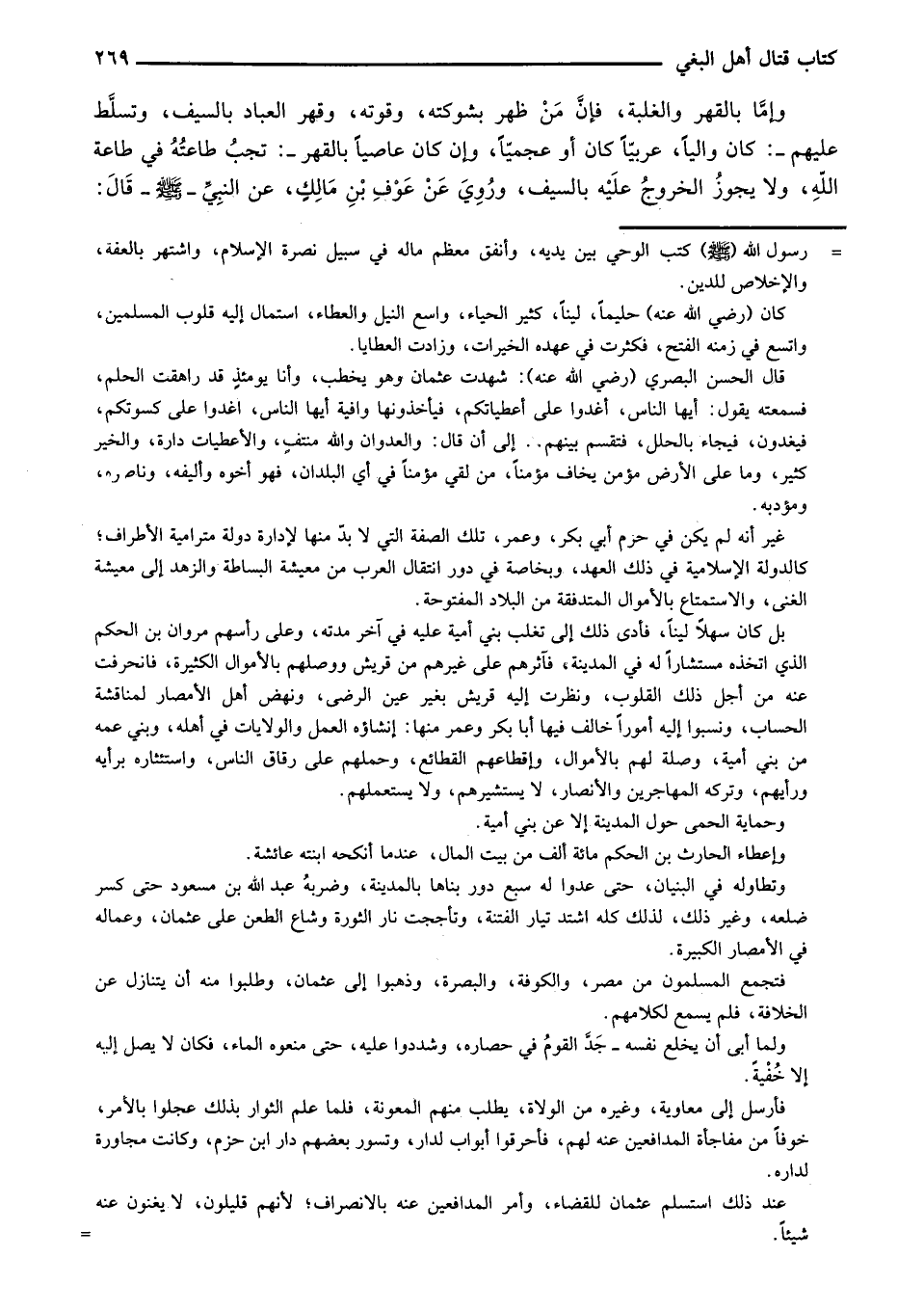 وإما بالقهر والغلبة، فإن من ظهر بشوكته، وقوته، وقهر العباد بالسيف، وتسلط عليهم-: كان والياً، عربياً، كان أو عجمياً، وإن كان عاصياً بالقهر -: تجبُ طاعته في طاعة الله، ولا يجوز الخروج عليه بالسيف، ورُوي عن عوف بن مالكٍ، عن النبي - صلى الله عليه وسلم - قال: