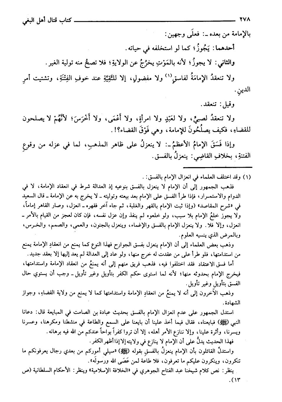 وإذا فسق الإمام الأعم-: لا ينعزل على اهر المذهب، لما في عزله من وقوع الفتنة، بخلاف القاضي: ينعزل بالفسق.
