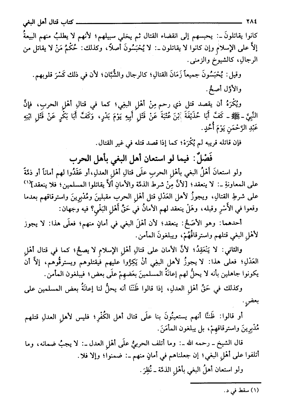 ويكره أن يقصد قتل ذي رحم من أهل البغي؛ كما في قتال أهل الحرب، فإن النبي - صلى الله عليه وسلم - كف أبا حذيفة بن عتبة عن قتل أبيه يوم بدرٍ، وكف أبا بكر عن قتل ابنه عبد الرحمن يوم أحدٍ.