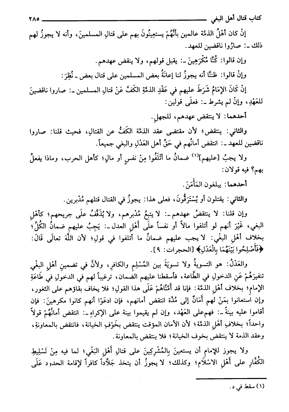 وإن قلنا: لا ينتقض عهدهم -: لا يتبع مدبرهم، ولا يُذفف على جريحهم؛ كأهل البغي، غير أنهم لو أتلفوا مالاً أو نفساً على أهل العدل -: يجب عليهم ضمان الكل؛ بخلاف أهل البغي: لا يجب عليهم ضمان ما أتلفوا في قول؛ لأن الله تعالى قال: {فَأَصْلِحُوا بَيْنَهُمَا بِالْعَدْلِ} [الحجرات: 9].