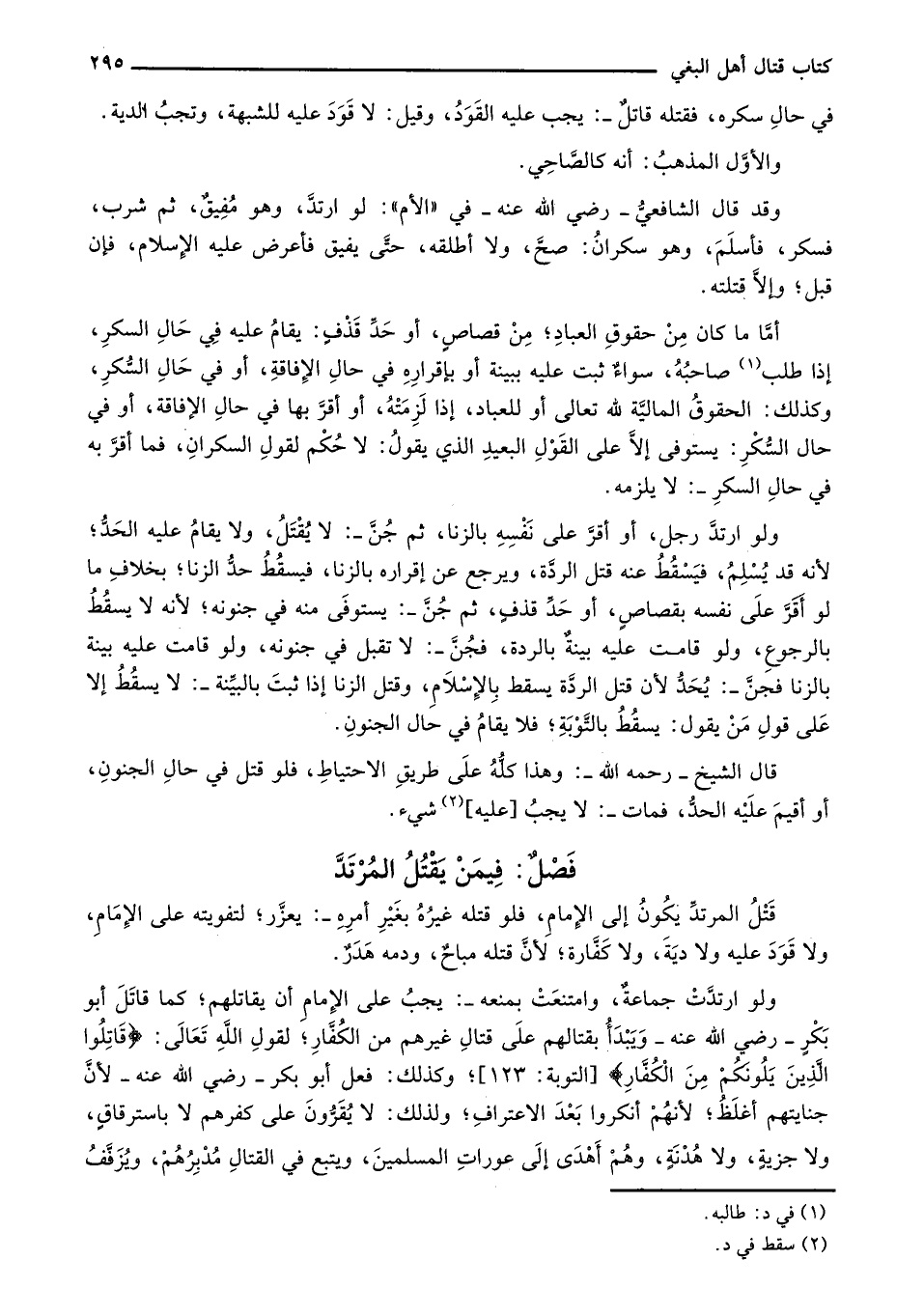 ولو ارتدت جماعةٌ، وامتنعت بمنعه-: يجب على الإمام أن يقاتلهم؛ كما قاتل أبو بكر -رضي الله عنه- ويبدأ بقتالهم على قتال غيرهم من الكفار؛ لقول الله تعالى: {قَاتِلُوا الَّذِينَ يَلُونَكُمْ مِنْ الْكُفَّارِ} [التوبة: 123]؛ وكذلك: فعل أبو بكر - رضي الله عنه- لأن جنايتهم أغلظ؛ لأنهم أنكروا بعد الاعتراف؛ ولذلك: لا يُقرون على كفرهم لا باسترقاق، ولا جزية، ولا هدنة، وهم أهدى إلى عورات المسلمين، ويتبع في القتال مدبرهم، ويُزفف