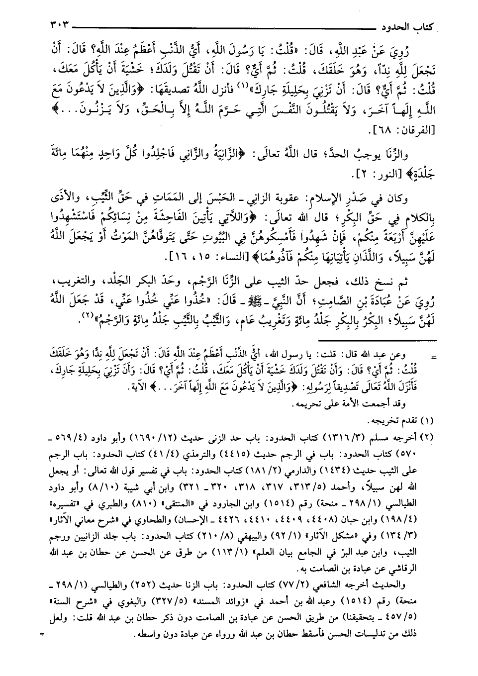 رُوي عن عبد الله، قال: "قلت: يا رسول الله، أي الذنب أعظم عند الله؟ قال: أن تجعل لله نداً، وهو خلقك، قلت: ثم أي؟ قال: أن تقتل ولدك؛ خشية أن يأكل معك، قلت: ثم أي؟ قال: أن تزني بحليلةِ جارك" فأنزل الله تصديقها: {الزَّانِيَةُ وَالزَّانِي فَاجْلِدُوا كُلَّ وَاحِدٍ مِنْهُمَا مِائَةَ جَلْدَةٍ} [النور: 2].