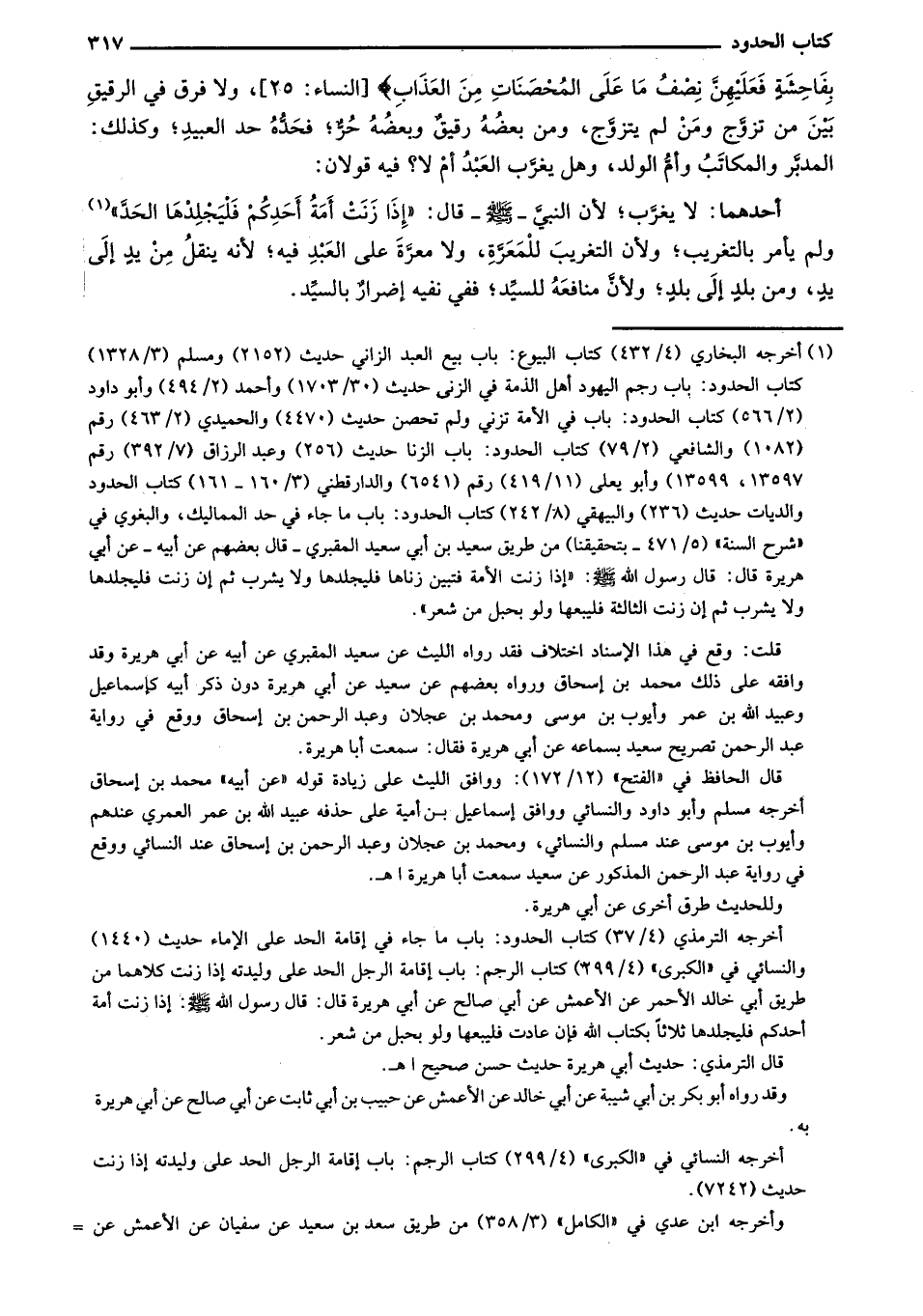 بِفَاحِشَةٍ فَعَلَيْهِنَّ نِصْفُ مَا عَلَى الْمُحْصَنَاتِ مِنْ الْعَذَابِ} [النساء: 25]، ولا فرق في الرقيق بين من تزوج ومن لم يتزوج، ومن بعضه رقيق وبعضه حر؛ فحده حد العبيد؛ وكذلك: المدبر والمكاتب وأم الولد، وهل يغرب العبد أم لا؟ فيه قولان: