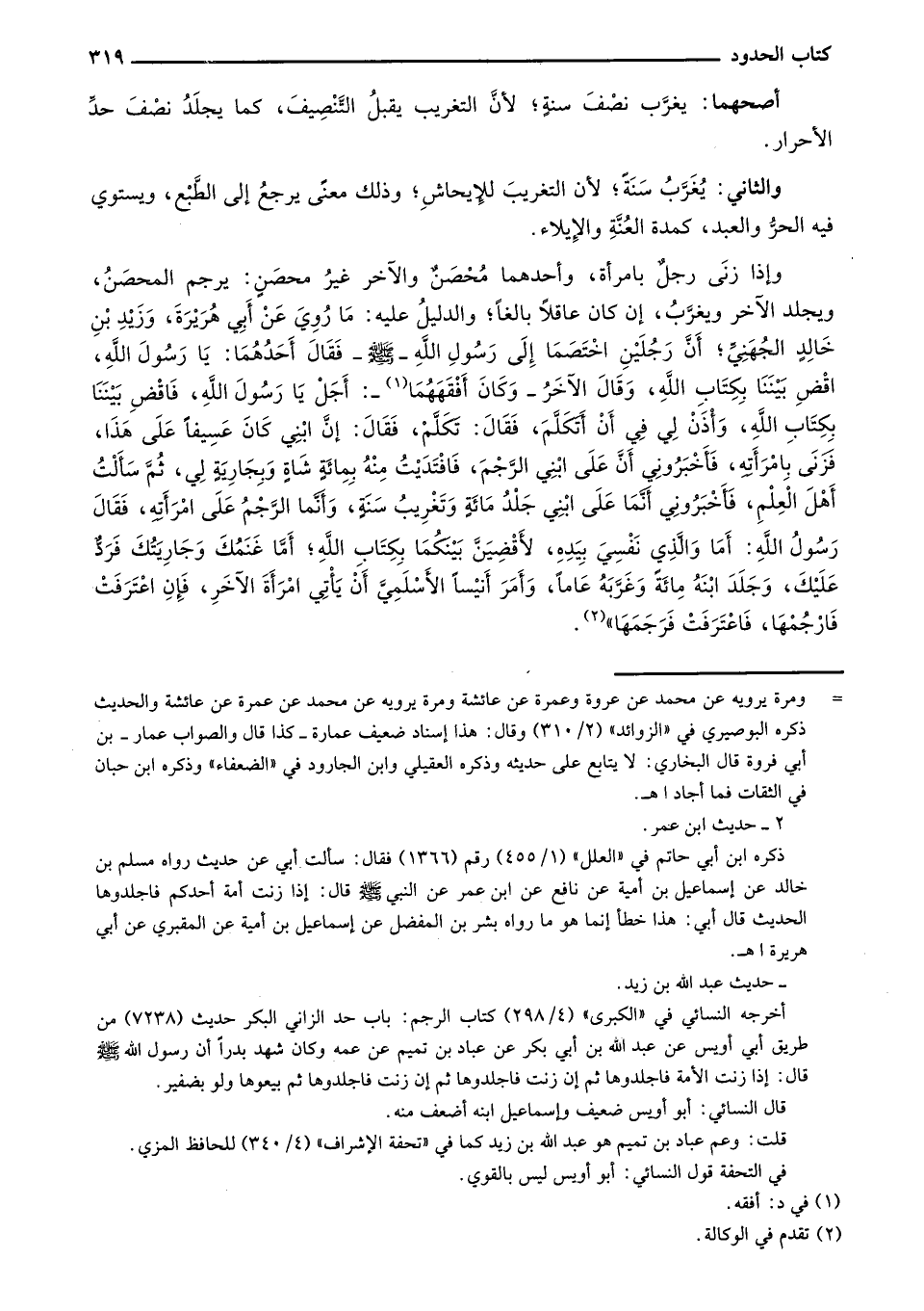 وإذا زنى رجل بامرأة، وأحدهما محصن والآخر غير محصن: يرجم المحصن، ويجلد الآخر ويغرب، إن كان عاقلاً بالغاً؛ والدليل عليه: ما رُوي عن أبي هريرة، وزيد بن خالد الجهني؛ أن رجلين اختصما إلى رسول الله - صلى الله عليه وسلم- فقال أحدهما: يا رسول الله، اقض بيننا بكتاب الله، وقال الآخر - وكان أفقههما -: أجل يا رسول الله، فاقض بيننا بكتاب الله، وأذن لي في أن أتكلم، فقال: تكلم، فقال: عن ابني كان عسيفاً على هذا، فزنى بامرأته، فأخبروني أن على ابني الرجم، فافتديت منه بمائة شاةٍ وبجارية لي، ثم سألت أهل العلم، فأخبروني أنما على ابني جلد مائةٍ وتغريب سنةٍ، وأنما الرجم على امرأته، فقال رسول الله: أما والذي نفسي بيده، لأقضين بينكما بكتاب الله؛ أما غنمُك وجاريتك فرد عليك، وجلد ابنه مائة وغربة عاماً، وأمر أنيساً الأسلمي أن يأتي امرأة الآخر، فإن اعترفت فارجمها، فاعترفت فرجمها".