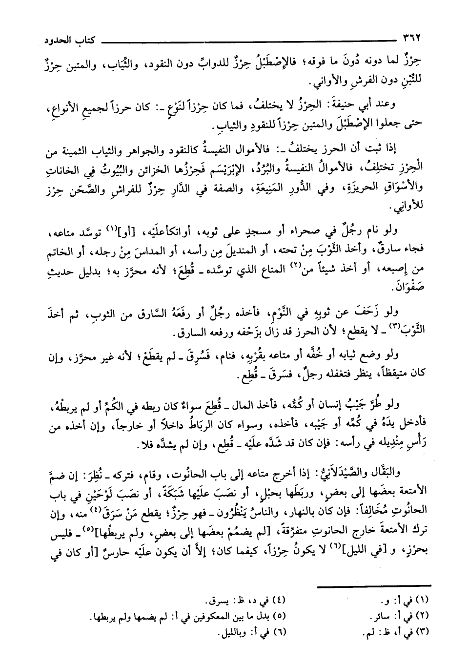 إذا ثبت أن الحرز يختلف-: فالأموال النفيسة كالنقود والجواهر والثياب الثمينة من الحرز تختلف، فالأموال النفيسة والبرد، الإبريسم فحرزها الخزائن والبيوت في الخانات والأسواق الحريزة، وفي الدور المنيعة، والصفة في الدار حرز للفراش والصحن حرز للأواني.