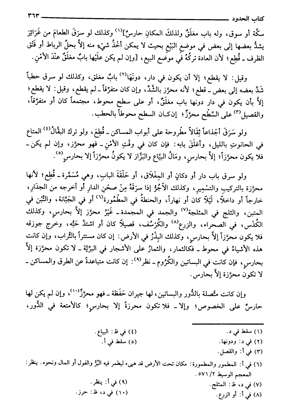 ولو سرق باب دار أو دكان أو المغلاق، أو حلقة الباب، وهي مسمرة- قطع؛ لأنها محرزة بالتركيب والتسمير، وكذلك الآجر إذا سرقه من صحن الدار أو أخرجه من الجدار، خارجاً أو داخلاً، ليلاً كان أو نهاراً، والحنطة في المطمورة أو في الجبانة، والتبن في المتبن، والثلج في المثلجة والجمد في المجمدة - غير محرز إلا بحارس، وكذلك الكدس، في الصحراء، والزرع والكرسف، قصيلاً كان أو اشتد حبهن وخرج جوزقه فلا يكون محرزاً إلا بحارس، وكذلك البذر في الأرض: إن كان مستتراً بالتراب، وإن كانت هذه الأشياء في محوط - فكالثمار، والثمار على الأشجار في البرية- لا تكون محرزة إلا بحارس، فإن كانت في البساتين والروم - نظر: إن كانت متباعدة عن الطرق والمساكن - لا تكون محرزة إلا بحارس.