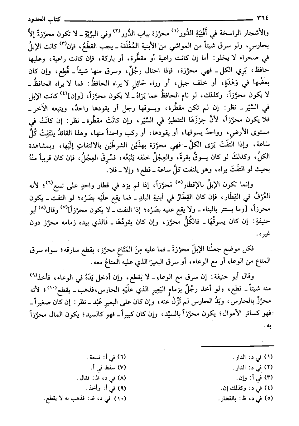 وإنما تكون الإبل بالإفطار محرزاً، إذا لم يزد في قطار واحد على تسع؛ لأنه العرف في القطار، فإن كان القطار في أبنية البلد - فما يقع عليه بصره؛ لو التفت - يكون محرزاً، [وما يستتر بالبناء - ولا يقع عليه بصره؛ إذا التفت - لا يكون محرزاً] وقال أبو حنيفة: إن كان يسوقها - فالكل محرز، وإن كان يقودها - فالذي بيده زمامه محرز دون غيره.