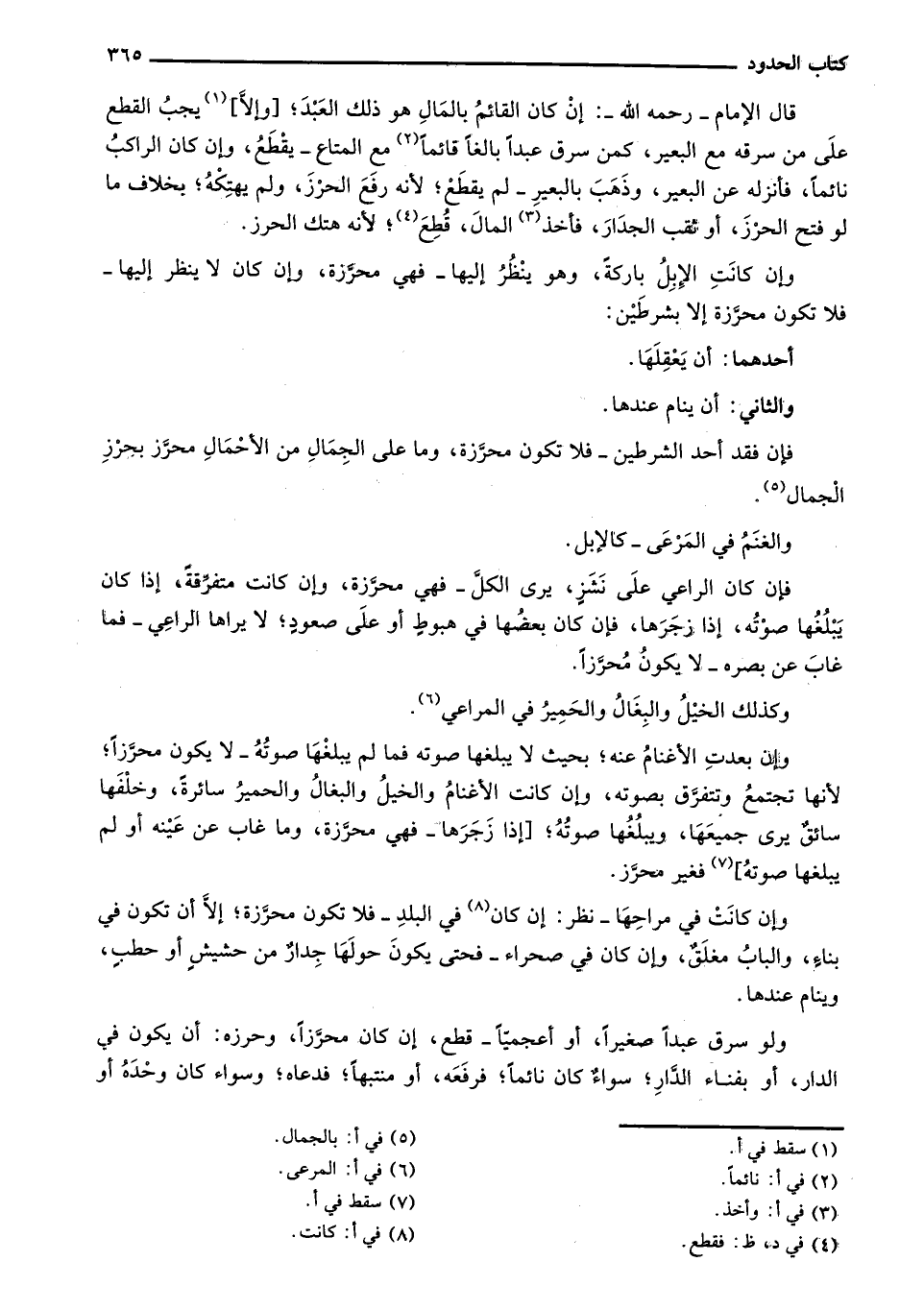 ولو سرق عبداً صغيراً، أو أعجمياً- قطع، إن كان محرزا، وحرزه: أن يكون في الدار، أو بفناء الدار؛ سواء كان نائماً؛ فرفعه، أو منبتها؛ فدعاه؛ وسواء كان وحده أو