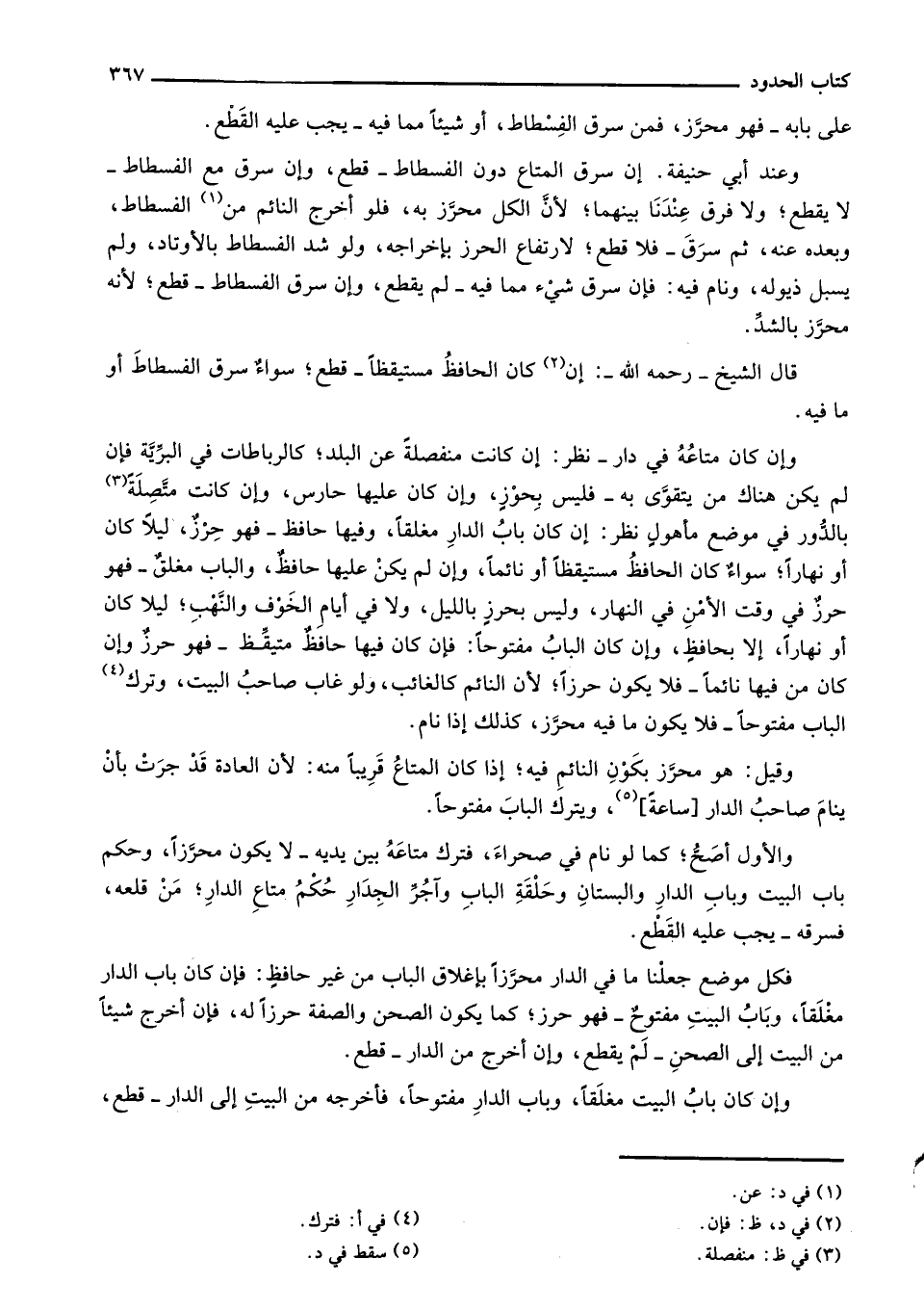 وإن كان متاعه في دار - نظر: إن كانت منفصلة عن البلد؛ كالرباطات في البرية فإن لم يكن هناك من يتقوى به- فليس بحوز، وإن كان عليها حارس، وإن كانت متصلة بالدور في موضع مأهول نظر: إن كان باب الدار مغلقاً، وفيها حافظ - فهو حرز، ليلاً كان أو نهاراً؛ سواء كان الحافظ مستيقظا أو نائماً، وإن لم يكن عليها حافظ، والباب مغلق - فهو حرز في وقت الأمن في النهار، وليس بحرز بالليلن ولا في أيام الخوف والنهب؛ ليلاً كان أو نهاراً، إلا بحافظ، وإن كان الباب مفتوحاً: فإن كان فيها حافظ متيقظ - فهو حرز وإن كان من فيها نائماً - فلا يكون حرزاً؛ لأن النائم الغائب، ولو غاب صاحب البيت، وترك الباب مفتوحاً- فلا يكون ما فيه محرز، كذلك إذا نام.