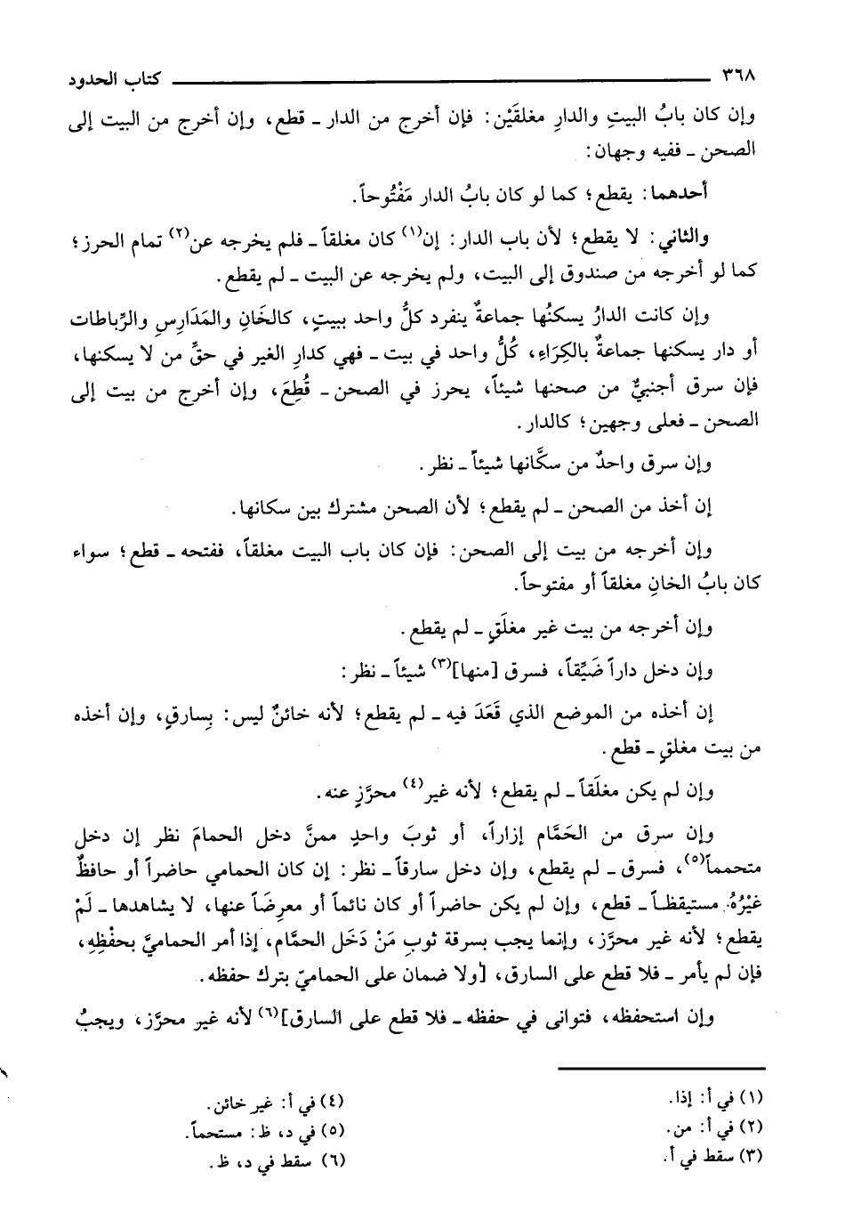 وإن كانت الدار يسكنها جماعة ينفرد كل واحد ببيت، كالخان والمدارس والرباطات أو دار يسكنها جماعة بالكراء، كل واحد في بيت - فهي كدار الغير فيحق من لا يسكنها، فإن سرق أجنبي من صحنها شيئاً، يحرز في الصحن - قطع، وإن أخرج من بيت إلى الصحن - فعلى وجهين؛ كالدار.