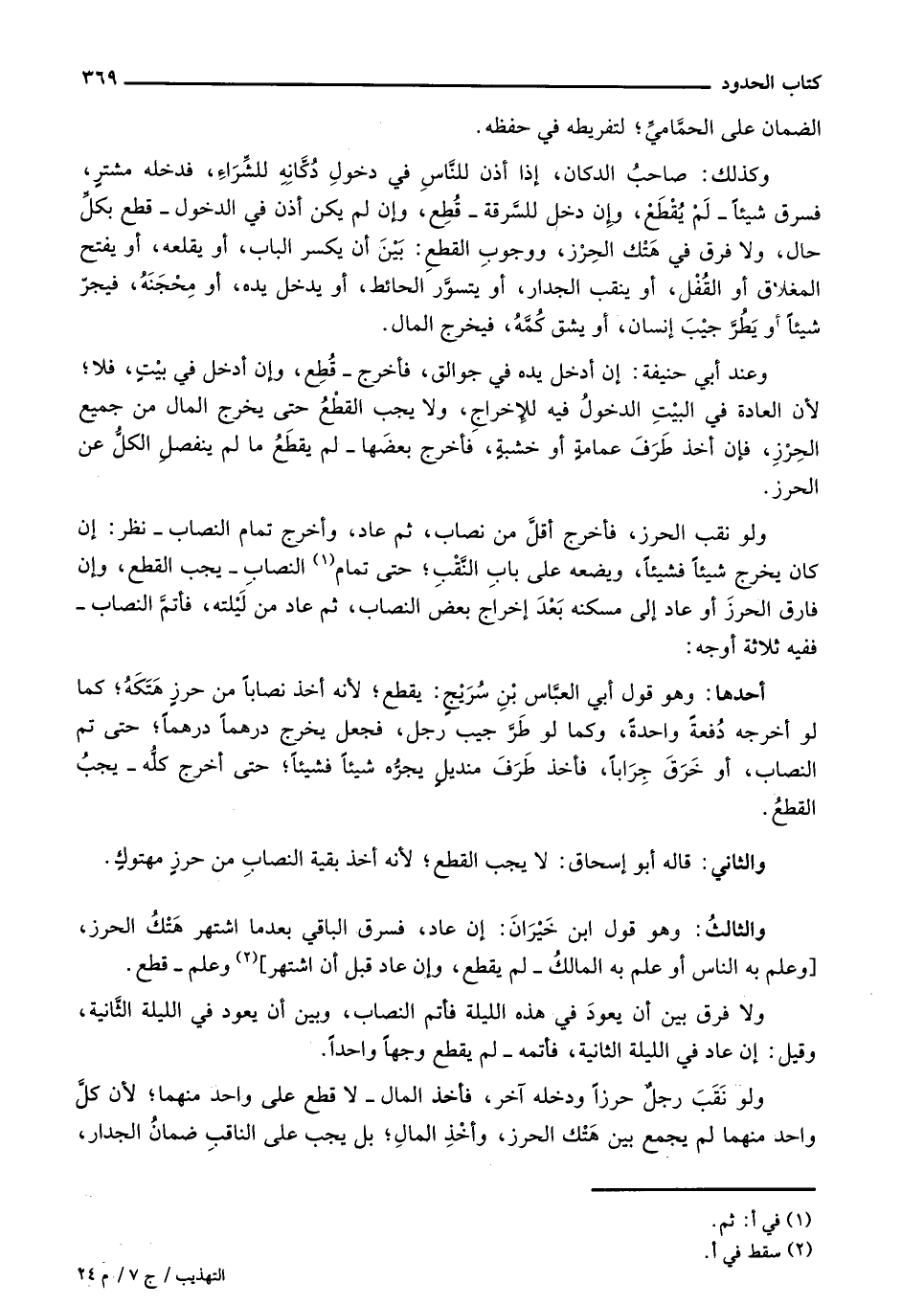 وكذلك: صاحب الدكان، إذا أذن للناس في دخول دكانه للشراء، فدخله مشتر، فسرق شيئاً - لم يُقطع، وإن دخل للسرقة - قطع، وإن لم يكن أذن في الدخول - قطع بكل حال، ولا فرق في هتك الحرز، ووجوب القطع: بين أن يكسر الباب، أو يقلعه، أو يفتح المغلاق أو القُفل، أو ينقب الجدار، أو يتسور الحائط، أو يدخل يده، أو محجنه، فيجر شيئاً أو يطُر جيب إنسان، أو يشق كمه، فيخرج المال.