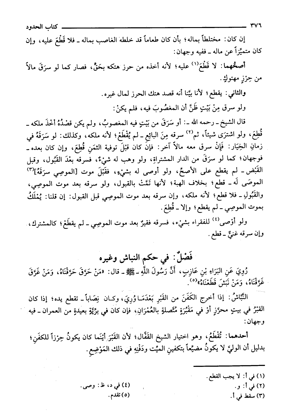 النباش: إذا أخرج الكفن من القبر بعدما وُري، وكان نصاباً - تقطع يده؛ إذا كان القبر في بيت محرز أو في مقبرة متصلة بالعمران، فإن كان في برية بعيدة من العمران - فيه وجهان: