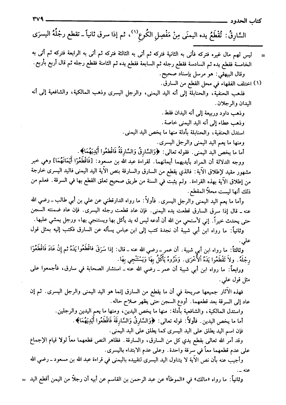 السارق: تقطع يده اليمنى من مفصل الكوع، ثم إذا سرق ثانياً - تقطع رجله اليسرى