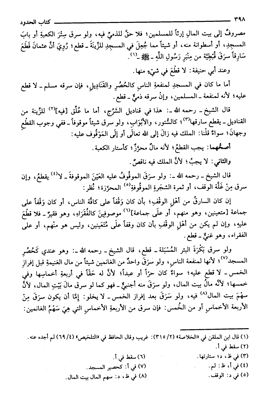 أما ما كان في المسد لمنفعة الناس كالحصر والقناديل، فإن سرقه مسلم - لا قطع عليه؛ لأنه لمنفعة -المسلمين، وإن سرقه ذمي - قطع.