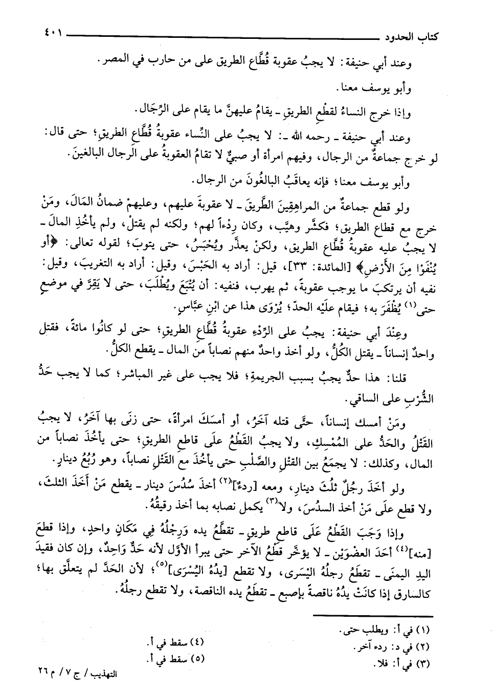وعند أبي حنيفة - رحمه الله-: لايجب على النساء عقوبة قُطاع الطريق؛ حتى قال: لو خرج جماعة من الرجال، وفيهم امرأة أو صبي لا تقام العقوبة على الرجال البالغين.