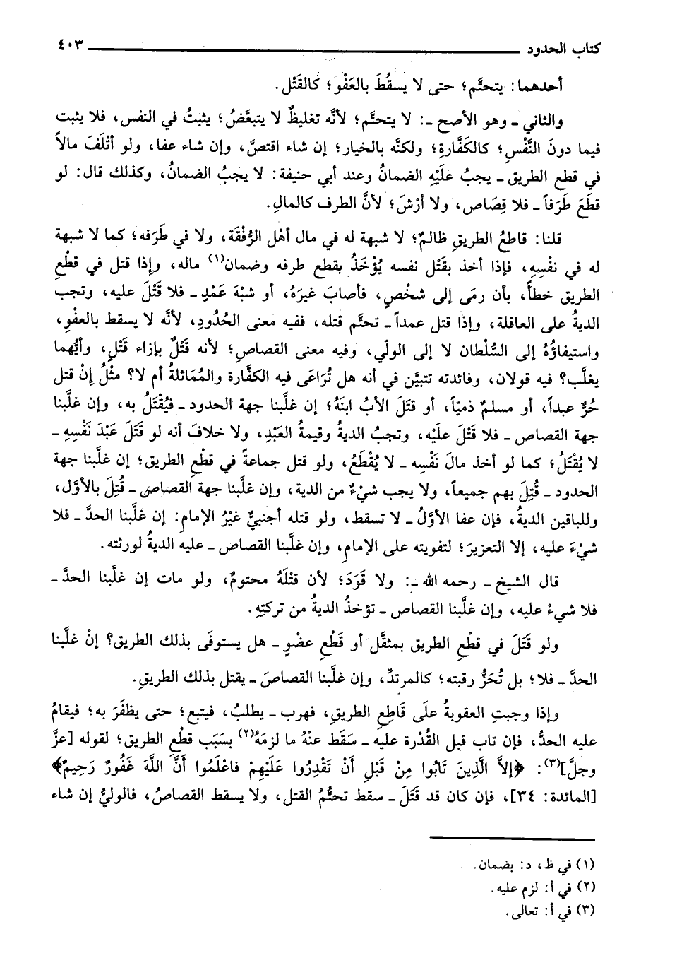 قلنا: قاطع الطريق ظالمٌ؛ لا شبهة له في مال أهل الرفقة، ولا في طرفه؛ ما لا شبهة له في نفسه، فإذا أخذ بقتل نفسه يؤخذ بقطع طرفه وضمان ماله، وإذا قتل في قطع الطريق خطأ، بأن رمى إلى شخص، فأصاب غيره، أو شبه عمدٍ - فلا قتل عليه، وتجب الدية على العاقلة، وإذا قتل عمداً - تحتم قتله، ففيه معنى الحدود، لأنه لا يسقط بالعفو، واستيفاؤه إلى السلطان لا إلى الولي، وفيه معنى القصاص؛ لأنه قتل بإزاء قتل، وأيهما يغلب؟ فيه قولان، وفائدته تتبني في أنه هل تُراعى فيه الكفارة والمماثلة أم لا؟ مثل إن قتل حر عبداً، أو مسلمٌ ذمياً، أو قتل الأب ابنه؛ إن غلبنا جهة الحدود - فيقتل به، وإن غلبنا جهة القصاص - فلا قتل عليه، وتجب الدية وقيمة العبد، ولا خلاف أنه لو قتل عبد نفسه - لا يقتل؛ كما لو أخذ مال نفسه - لا يُقطع، ولو قتل جماعةً في قطع الطريق؛ إن غلبنا جهة الحدود - قُتل بهم جميعاً، ولا يجب شيء من الدية، وإن غلبنا جهة القصاص - قُتل بالأول، وللباقين الدية، فإن عفا الأول - لا تسقط، ولو قتله أجنبي غير الإمام: إن غلبنا الحد - فلا شيء عليه، إلا التعزير؛ لتفويته على الإمام، وإن غلبنا القصاص - عليه الدية لورثته.