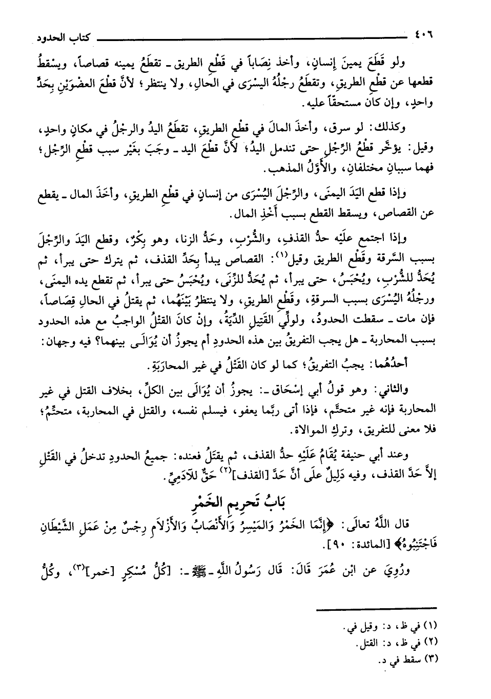 وإذا اجتمع عليه حد القذف، والشرب، وحد الزنا، وهو بكر، وقطع اليد والرجل بسبب السرقة وقطع الطريق وقيل: القصاص يبدأ بحد القذف، ثم يترك حتى يبرأ، ثم يُحد للشرب، ويحبس، حتى يبرأ، ثم يحد للزنى، ويحبس حتى يبرأ، ثم تقطع يده اليمنى، ورجله اليسرى بسبب السرقة، وقطع الطريق، ولا ينتظر بينهما، ثم يقتل في الحال قصاصاً، فإن مات - سقطت الحدود، لوولي القتيل الدية، وإن كان القتل الواجب مع هذه الحدود بسبب المحاربة- هل يجب التفريق بين هذه الحدود أم يجوز أن يُوالي بينهما؟ فيه وجهان: