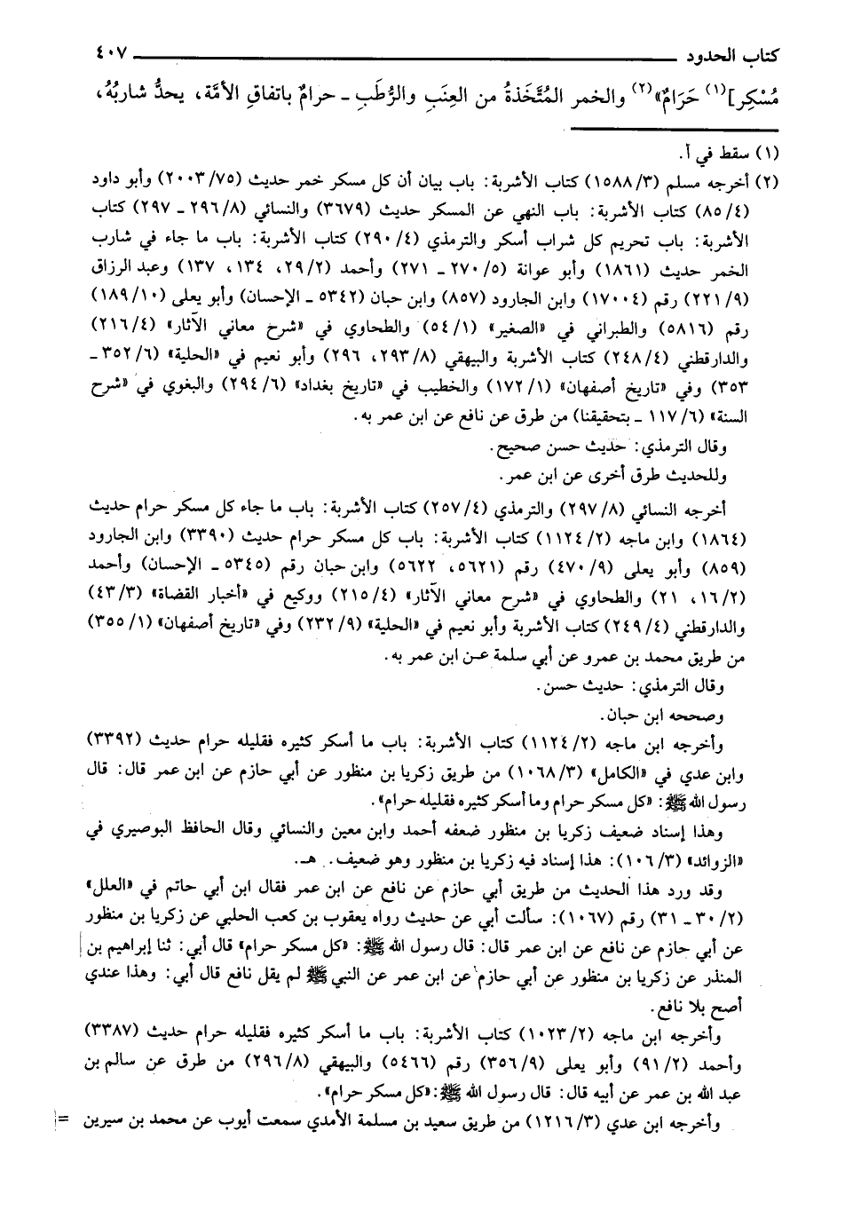 مسكر] حرامٌ" والخمر المتخذة من العنب والرطب - حرام باتفاق الأمة، يحد شاربه،