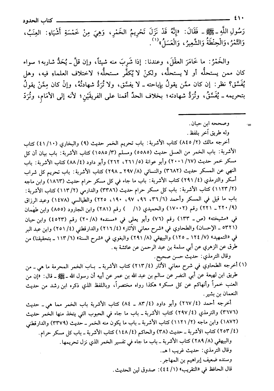 رسول الله - صلى الله عليه وسلم - فقال: "إنه قد نزل تحريم الخمر، وهي من خمسة أشياء: العنب، والتمر، والحنطة والشعير، والعسل".