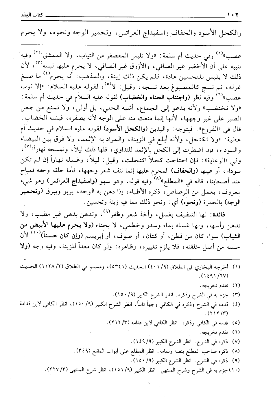ـــــــــــــــــــــــــــــQعَصْبٍ» وَفِي حَدِيثِ أُمِّ سَلَمَةَ «وَلَا تَلْبَسُ الْمُعَصْفَرَ مِنَ الثِّيَابِ، وَلَا الْمُمَشَّقَ» وَفِيهِ تَنْبِيهٌ عَلَى أَنَّ الْأَخْضَرَ غَيْرَ الصَّافِي، وَالْأَزْرَقَ غَيْرَ الصَّافِي، لَا يَحْرُمُ عَلَيْهَا لُبْسُهُ ; لِأَنَّ ذَلِكَ لَا يُلْبَسُ لِلتَّحْسِينِ عَادَةً، فَلَمْ يَكُنْ ذَلِكَ زِينَةً، وَالْمَذْهَبُ أَنَّهُ يَحْرُمُ مَا صُبِغَ غَزْلُهُ، ثُمَّ نُسِجَ كَالْمَصْبُوغِ بَعْدَ نَسْجِهِ، وَقِيلَ: لَا ; لِقَوْلِهِ - عَلَيْهِ السَّلَامُ - «إِلَّا ثَوْبَ عَصْبٍ» وَفِيهِ نَظَرٌ. (وَاجْتِنَابُ الْحِنَّاءِ، وَالْخِضَابِ) لِقَوْلِهِ - عَلَيْهِ السَّلَامُ - فِي حَدِيثِ أُمِّ سَلَمَةَ «وَلَا تَخْتَضِبُ» وَلِأَنَّهُ يَدْعُو إِلَى الْجِمَاعِ، أَشْبَهَ الْحُلِيَّ، بَلْ أَوْلَى، وَلَا تُمْنَعُ مِنْ جَعْلِ الصَّبْرِ عَلَى غَيْرِ وَجْهِهَا ; لِأَنَّهَا إِنَّمَا مُنِعَتْ مِنْهُ عَلَى الْوَجْهِ ; لِأَنَّهُ يُصَفِّرُهُ فَيُشْبِهُ الْخِضَابَ، قَالَ فِي " الْفُرُوعِ ": فَيَتَوَجَّهُ، وَالْيَدَيْنِ (وَالْكُحْلِ الْأَسْوَدِ) لِقَوْلِهِ - عَلَيْهِ السَّلَامُ - فِي حَدِيثِ أُمِّ عَطِيَّةَ «وَلَا تَكْتَحِلُ» وَلِأَنَّهُ أَبْلَغُ فِي الزِّينَةِ، وَالْمُرَادُ بِهِ الْإِثْمِدُ، وَلَا فَرْقَ بَيْنَ الْبَيْضَاءِ، وَالسَّوْدَاءِ، فَإِنِ اضْطُرَّتْ إِلَى الْكُحْلِ بِالْإِثْمِدِ لِلتَّدَاوِي فَلَهَا ذَلِكَ لَيْلًا وَتَمْسَحُهُ نَهَارًا، وَفِي " الرِّعَايَةِ ": فَإِنِ احْتَاجَتْ كُحْلًا اكْتَحَلَتْ، وَقِيلَ: لَيْلًا وَغَسَلَهُ نَهَارًا إِنْ لَمْ تَكُنْ سَوْدَاءَ، أَوْ عَيْنُهَا. (وَالْحُفَافِ) الْمُحَرَّمِ عَلَيْهَا إِنَّمَا نَتْفُ شَعَرِ وَجْهِهَا فَأَمَّا حَلْقُهُ وَحَفَّهُ فَمُبَاحٌ، عند أَصْحَابُنَا، قَالَهُ فِي "الْمَطْلَعِ" وَفِيهِ قَوْلٌ، وَهُوَ سَهْوٌ. (وَإِسْفِيدَاجِ الْعَرَائِسِ) وَهُوَ شَيْءٌ مَعْرُوفٌ يُعْمَلُ مِنَ الرَّصَاصِ ذَكَرَهُ الْأَطِبَّاءُ إِذَا دُهِنَ بِهِ الْوَجْهُ يَرْبُو وَيَبْرُقُ (وَتَحْمِيرِ الْوَجْهِ) بِالْحُمْرَةِ (وَنَحْوِهِ) أَيْ: وَنَحْوُ ذَلِكَ مِمَّا فِيهِ زِينَةٌ وَتَحْسِينٌ.