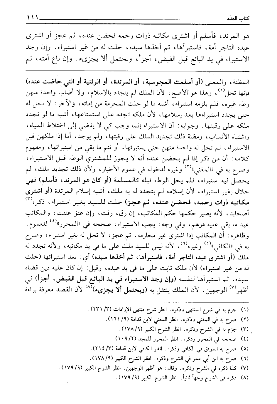 ـــــــــــــــــــــــــــــQالْمَظِنَّةِ، وَالْمَعْنَى (أَوْ أَسْلَمَتِ الْمَجُوسِيَّةُ، أَوِ الْمُرْتَدَّةُ، أَوِ الْوَثَنِيَّةُ، أَوِ الَّتِي حَاضَتْ عِنْدَهُ) فَإِنَّهَا تَحِلُّ، وَهَذَا هُوَ الْأَصَحُّ ; لِأَنَّ الْمِلْكَ لَمْ يَتَجَدَّدْ بِالْإِسْلَامِ، وَلَا أَصَابَ وَاحِدَةً مِنْهُنَّ وَطْءُ غَيْرِهِ، فَلَمْ يَلْزَمْهُ اسْتِبْرَاءٌ، أَشْبَهَ مَا لَوْ حَلَّتِ الْمُحَرَّمَةُ مِنْ إِمَائِهِ، وَالْآخَرُ لَا تَحِلُّ لَهُ حَتَّى يُجَدِّدَ اسْتِبْرَاءَهَا بَعْدَ إِسْلَامِهَا ; لِأَنَّ مِلْكَهُ تَجَدَّدَ عَلَى اسْتِمْتَاعِهَا، أَشَبَهَ مَا لَوْ تَجَدَّدَ مِلْكُهُ عَلَى رَقَبَتِهَا، وَجَوَابُهُ: أَنَّ الِاسْتِبْرَاءَ إِنَّمَا وَجَبَ كَيْ لَا يُفْضَى إِلَى اخْتِلَاطِ الْمِيَاهِ وَاشْتِبَاهِ الْأَنْسَابِ، وَمَظِنَّةُ ذَلِكَ تَجْدِيدُ الْمِلْكِ عَلَى رَقَبَتِهَا، وَلَمْ يُوجَدْ، أَمَّا إِذَا مَلَكَهُنَّ قَبْلَ الِاسْتِبْرَاءِ لَمْ تَحِلَّ لَهُ وَاحِدَةٌ مِنْهُنَّ حَتَّى يَسَتْبَرِئَهَا، أَوْ تُتِمُّ مَا بَقِيَ مِنِ اسْتِبْرَائِهَا، وَمَفْهُومُ كَلَامِهِ أَنَّ مَنْ ذَكَرَ إِذَا لَمْ يَحِضْنَ عِنْدَهُ أَنَّهُ لَا يَجُوزُ لِلْمُشْتَرِي الْوَطْءُ قَبْلَ الِاسْتِبْرَاءِ، وَصَرَّحَ بِهِ فِي " الْمُغْنِي " وَغَيْرِهِ لِدُخُولِهِ فِي عُمُومِ الْأَخْبَارِ، وَلِأَنَّ ذَلِكَ تَجْدِيدُ مِلْكٍ لَمْ يَحْصُلْ فِيهِ اسْتِبْرَاءٌ، فَلَمْ يَحِلَّ الْوَطْءُ قَبْلَهُ كَالْمُسْلِمَةِ (أَوْ كَانَ هُوَ الْمُرْتَدَّ فَأَسْلَمَ) فَهِيَ حَلَالٌ بِغَيْرِ اسْتِبْرَاءٍ ; لِأَنَّ إِسْلَامَهُ لَمْ يَتَجَدَّدْ لَهُ بِهِ مِلْكٌ، أَشْبَهَ إِسْلَامَ الْمُرْتَدَّةِ (أَوْ اشْتَرَى مُكَاتَبَه ذَوَاتِ رَحِمَهُ فَحِضْنَ عِنْدَهُ، ثُمَّ عَجَزَ) حَلَّتْ لِلسَّيِّدِ بِغَيْرِ اسْتِبْرَاءٍ ذَكَرَهُ أَصْحَابُنَا ; لِأَنَّهُ يَصِيرُ حُكْمُهَا حُكْمَ الْمَكَاتَبِ إِنْ رَقَّ رَقَّتْ، وَإِنْ عَتَقَ عَتَقَتْ، وَالْمَكَاتَبُ عَبْدٌ مَا بَقِيَ عَلَيْهِ دِرْهَمٌ، وَفِي الْوَجْهِ يَجِبُ الِاسْتِبْرَاءُ صَحَّحَهُ فِي " الْمُحَرَّرِ " لِلْعُمُومِ، وَظَاهِرُهُ أَنَّ الْمَكَاتِبَ إِذَا اشْتَرَى غَيْرَ مَحَارِمِهِ، ثُمَّ عَجَزَ لا تَحِلُّ لَهُ بِغَيْرِ اسْتِبْرَاءٍ، وَصَرَّحَ بِهِ فِي " الْكَافِي " وَغَيْرِهِ ; لِأَنَّهُ لَيْسَ لِلسَّيِّدِ مِلْكٌ عَلَى مَا فِي يَدِ مُكَاتِبِهِ، وَلِأَنَّهُ تَجَدَّدَ لَهُ مِلْكٌ (أَوْ اشْتَرَى عَبْدَهُ التَّاجِرُ أَمَةً فَاسْتَبْرَأَهَا، ثُمَّ أَخَذَهَا سَيِّدُهُ) أَيْ: بَعْدَ اسْتِبْرَائِهَا (حَلَّتْ لَهُ مِنْ غَيْرِ اسْتِبْرَاءٍ) لِأَنَّ مِلْكَهُ ثَابِتٌ عَلَى مَا فِي يَدِ عَبْدِهِ، وَقِيلَ: إِنْ كَانَ عَلَيْهِ دَيْنٌ قَضَاهُ سَيِّدُهُ، ثُمَّ اسْتَبْرَأَهَا لِنَفْسِهِ. (وَإِنْ وَجَدَ الِاسْتِبْرَاءَ فِي يَدِ الْبَائِعِ قَبْلَ الْقَبْضِ أَجْزَأَ) فِي أَظْهَرِ الْوَجْهَيْنِ ; لِأَنَّ الْمِلْكَ يَنْتَقِلُ بِهِ (وَيَحْتَمِلُ أَلَّا يُجْزِئَ) لِأَنَّ الْقَصْدَ مَعْرِفَةُ بَرَاءَةِ