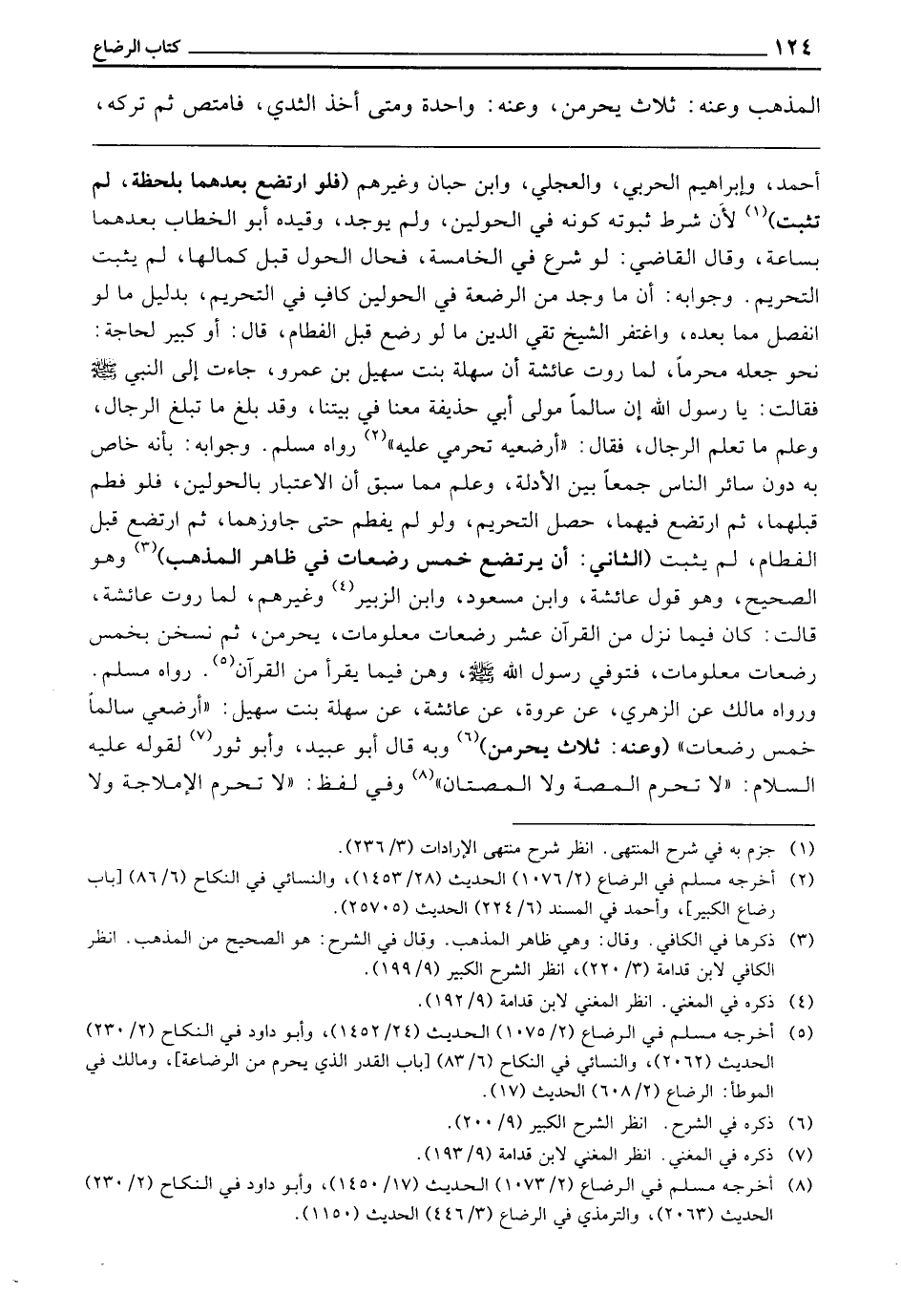 ـــــــــــــــــــــــــــــQأَحْمَدُ، وَإِبْرَاهِيمُ الْحَرْبِيُّ، وَالْعِجْلِيُّ، وَابْنُ حِبَّانَ وَغَيْرُهُمْ (فَلَوِ ارْتَضَعَ بَعْدَهُمَا بِلَحْظَةٍ لَمْ تَثْبُتْ) لِأَنَّ شَرْطَ ثُبُوتِهِ كَوْنُهُ فِي الْحَوْلَيْنِ، وَلَمْ يُوجَدْ، وَقَيَّدَهُ أَبُو الْخَطَّابِ بِعْدَهُمَا بِسَاعَةٍ، وَقَالَ الْقَاضِي: لَوْ شَرَعَ فِي الْخَامِسَةِ فَحَالَ الْحَوْلُ قَبْلَ كَمَالِهَا لَمْ يَثْبُتِ التَّحْرِيمُ، وَجَوَابُهُ: أَنَّ مَا وُجِدَ مِنَ الرَّضْعَةِ فِي الْحَوْلَيْنِ كَافٍ فِي التَّحْرِيمِ بِدَلِيلِ مَا لَوِ انْفَصَلَ مِمَّا بَعْدَهُ وَاغْتَفَرَ الشَّيْخُ تَقِيُّ الدِّينِ مَا لَوْ رَضَعَ قَبْلَ الْفِطَامِ، قَالَ: أَوْ كَبِيرٌ لِحَاجَةٍ نَحْوَ جَعْلِهِ مُحَرَّمًا لِمَا رَوَتْ عَائِشَةُ «أَنَّ سَهْلَةَ بِنْتَ سُهَيْلِ بْنِ عَمْرٍو جَاءَتْ إِلَى النَّبِيِّ - صَلَّى اللَّهُ عَلَيْهِ وَسَلَّمَ - فَقَالَتْ: يَا رَسُولَ اللَّهِ إِنَّ سَالِمًا مَوْلَى أَبِي حُذَيْفَةَ مَعَنَا فِي بَيْتِنَا، وَقَدْ بَلَغَ مَا تَبْلُغُ الرِّجَالُ وَعَلِمَ مَا تَعْلَمُ الرِّجَالُ، فَقَالَ: أَرَضِعِيهِ تَحْرُمِي عَلَيْهِ» رَوَاهُ مُسْلِمٌ، وَجَوَابُهُ: بِأَنَّهُ خَاصٌّ بِهِ دُونَ سَائِرِ النَّاسِ جَمْعًا بَيْنَ الْأَدِلَّةِ، وَعُلِمَ مِمَّا سَبَقَ أَنَّ الِاعْتِبَارَ بِالْحَوْلَيْنِ، فَلَوْ فُطِمَ قَبْلَهُمَا، ثُمَّ ارْتَضَعَ فِيهِمَا حَصَلَ التَّحْرِيمُ، وَلَوْ لَمْ يُفْطَمْ حَتَّى جَاوَزَهُمَا، ثُمَّ ارْتَضَعَ قَبْلَ الْفِطَامِ لَمْ يُثْبِتْ
