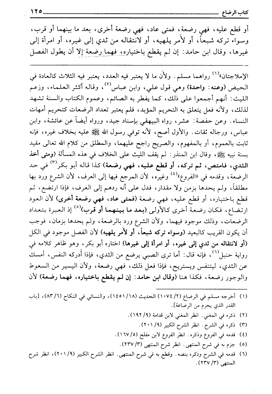 ـــــــــــــــــــــــــــــQالْإِمْلَاجَتَانِ» رَوَاهُمَا مُسْلِمٌ، وَلِأَنَّ مَا لَا يُعْتَبَرُ فِيهِ الْعَدَدُ يُعْتَبَرُ فِيهِ الثَّلَاثُ كَالْعَادَةِ فِي الْحَيْضِ (وَعَنْهُ: وَاحِدَةٌ) وَهِيَ قَوْلُ عَلِيٍّ، وَابْنِ عَبَّاسٍ، وَقَالَهُ أَكْثَرُ الْعُلَمَاءِ، وَزَعَمَ اللَّيْثُ أَنَّهُمْ أَجْمَعُوا عَلَى ذَلِكَ كَمَا يُفْطِرُ بِهِ الصَّائِمُ. وَعُمُومُ الْكِتَابِ وَالسُّنَّةِ تَشْهَدُ لِذَلِكَ، وَلِأَنَّهُ فِعْلٌ يَتَعَلَّقُ بِهِ التَّحْرِيمُ الْمُؤَبَّدُ، فَلَمْ يُعْتَبَرْ تَعْدَادُ الرَّضَعَاتِ كَتَحْرِيمِ أُمَّهَاتِ النِّسَاءِ، وَعَنْ حَفْصَةَ: عَشْرٌ، رَوَاهُ الْبَيْهَقِيُّ بِإِسْنَادٍ جَيِّدٍ، وَرَوَاهُ أَيْضًا عَنْ عَائِشَةَ، وَابْنِ عَبَّاسٍ. وَرِجَالُهُ ثِقَاتٌ، وَالْأَوَّلُ أَصَحُّ ; لِأَنَّهُ تُوُفِّيَ رَسُولُ اللَّهِ - صَلَّى اللَّهُ عَلَيْهِ وَسَلَّمَ - عَلَيْهِ بِخِلَافِ غَيْرِهِ، فَإِنَّهُ ثَابِتٌ بِالْعُمُومِ، أَوْ بِالْمَفْهُومِ، وَالصَّرِيحُ رَاجِحٌ عَلَيْهِمَا، وَالْمُطْلَقُ مِنْ كَلَامِ اللَّهِ تَعَالَى مُقَيَّدٌ بِسُنَّةِ نَبِيهِ - صَلَّى اللَّهُ عَلَيْهِ وَسَلَّمَ -، وَقَالَ ابْنُ الْمُنْذِرِ: لَمْ يَقِفِ اللَّيْثُ عَلَى الْخِلَافِ فِي هَذِهِ الْمَسْأَلَةِ (وَمَتَى أَخَذَ الثَّدْيَ فَامْتَصَّ، ثُمَّ تَرَكَهُ، أَوْ قُطِعَ عَلَيْهِ فَهِيَ رَضْعَةٌ) كَذَا قَالَهُ أَبُو بَكْرٍ فِي حَدِّ الرَّضْعَةِ، وَقَدَّمَهُ فِي " الْفُرُوعِ " وَغَيْرِهِ ; لِأَنَّ الْمَرْجِعَ فِيهَا إِلَى الْعُرْفِ ; لِأَنَّ الشَّرْعَ وَرَدَ بِهَا مُطْلَقًا، وَلَمْ يَحُدَّهَا بِزَمَنٍ، وَلَا مِقْدَارٍ فَدَلَّ عَلَى أَنَّهُ رَدَّهُمْ إِلَى الْعُرْفِ، فَإِذَا ارْتَضَعَ، ثُمَّ قَطَعَ بِاخْتِيَارِهِ، أَوْ قُطِعَ عَلَيْهِ فَهِيَ رَضْعَةٌ (فَمَتَى عَادَ فَهِيَ رَضْعَةٌ أُخْرَى) لِأَنَّ الْعَوْدَ ارْتِضَاعٌ، فَكَانَ رَضْعَةً أُخْرَى كَالْأُولَى (بَعُدَ مَا بَيْنَهُمَا أَوْ قَرُبَ) إِذِ الْعِبْرَةُ بِتَعْدَادِ الرَّضَعَاتِ، وَذَلِكَ مَوْجُودٌ فِيهِمَا، وَلِأَنَّ الشَّرْعَ وَرَدَ بِالرَّضْعَةِ، وَلَمْ يَحُدَّهَا بِزَمَانٍ فَوَجَبَ أَنْ يَكُونَ الْقَرِيبُ كَالْبَعِيدِ (وَسَوَاءٌ تَرَكَهُ شِبَعًا، أَوْ لِأَمْرٍ يُلْهِيهِ) لِأَنَّ الْفَصْلَ مَوْجُودٌ فِي الْكُلِّ (أَوْ لِانْتِقَالِهِ مِنْ ثَدْيٍ إِلَى غَيْرِهِ، أَوِ امْرَأَةٍ إِلَى غَيْرِهَا) اخْتَارَهُ أَبُو بَكْرٍ، وَهُوَ ظَاهِرُ كَلَامِهِ فِي رِوَايَةِ حَنْبَلٍ، فَإِنَّهُ قَالَ: أَمَا تَرَى الصَّبِيَّ يَرْضَعُ مِنَ الثَّدْيِ، فَإِذَا أَدْرَكَهُ النَّفَسُ أَمْسَكَ عَنِ الثَّدْيِ لِيَتَنَفَّسَ وَيَسْتَرِيحَ، فَإِذَا فَعَلَ ذَلِكَ فَهِيَ رَضْعَةٌ، وَلِأَنَّ الْيَسِيرَ مِنَ السُّعُوطِ، وَالْوَجُورِ رَضْعَةٌ، فَكَذَا هُنَا (وَقَالَ ابْنُ حَامِدٍ: إِنْ لَمْ يَقْطَعْ بِاخْتِيَارِهِ فُهُمَا رَضْعَةٌ) لِأَنَّ