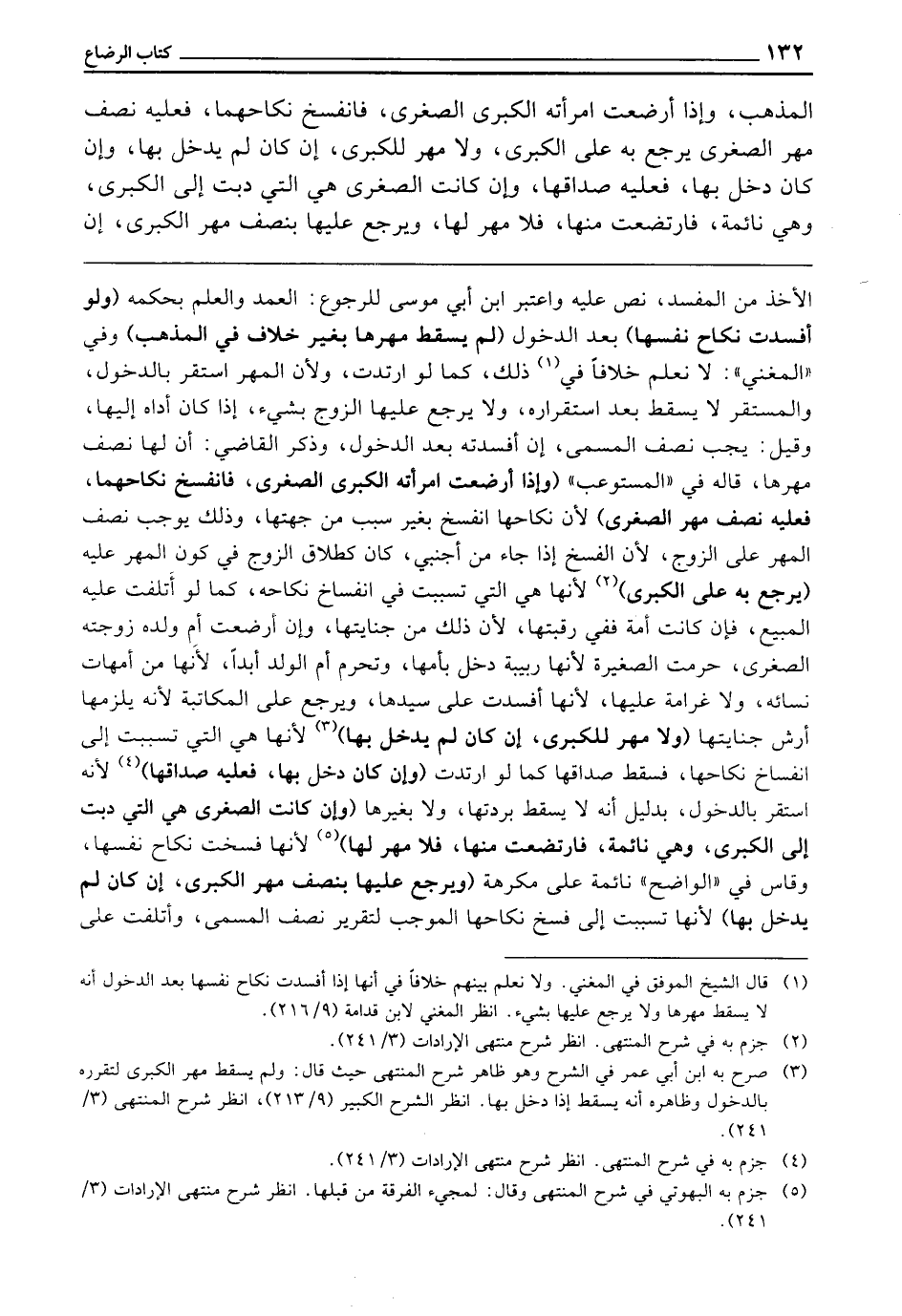 الْمَذْهَبِ، وَإِذَا أَرْضَعَتِ امْرَأَتُهُ الْكُبْرَى الصُّغْرَى، فَانْفَسَخَ نِكَاحُهُمَا فَعَلَيْهِ نِصْفُ مَهْرِ الصُّغْرَى يَرْجِعُ بِهِ عَلَى الْكُبْرَى وَلَا مَهْرَ لِلْكُبْرَى إِنْ كَانَ لَمْ يَدْخُلْ بِهَا، وَإِنْ كَانَ دَخَلَ بِهَا فَعَلَيْهِ صَدَاقُهَا، وَإِنْ كَانَتِ الصُّغْرَى هِيَ الَّتِي دَبَّتْ إِلَى الْكُبْرَى، وَهِيَ نَائِمَةٌ فَارْتَضَعَتْ مِنْهَا، فَلَا مَهْرَ لَهَا وَيَرْجِعُ عَلَيْهَا بِنِصْفِ مَهْرِ الْكُبْرَى إِنْ