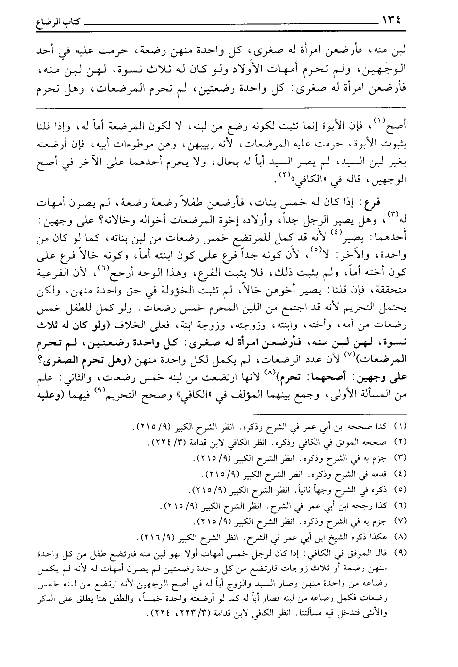 لَبَنٌ مِنْهُ فَأَرْضَعْنَ امْرَأَةً لَهُ صُغْرَى، كُلُّ وَاحِدَةٍ مِنْهُنَّ رَضْعَةً حَرُمَتْ عَلَيْهِ فِي أَحَدِ الْوَجْهَيْنِ وَلَمْ تَحْرُمْ أُمَّهَاتُ الْأَوْلَادِ. وَلَوْ كَانَ لَهُ ثَلَاثُ نِسْوَةٍ لَهُنَّ لَبَنٌ مِنْهُ، فَأَرْضَعْنَ امْرَاةً لَهُ صُغْرَى، كُلُّ وَاحِدَةِ رَضْعَتَيْنِ لَمْ تَحْرُمِ الْمُرْضِعَاتُ، وَهَلْ تَحْرُمُ